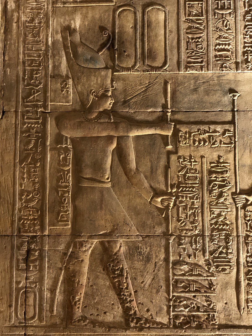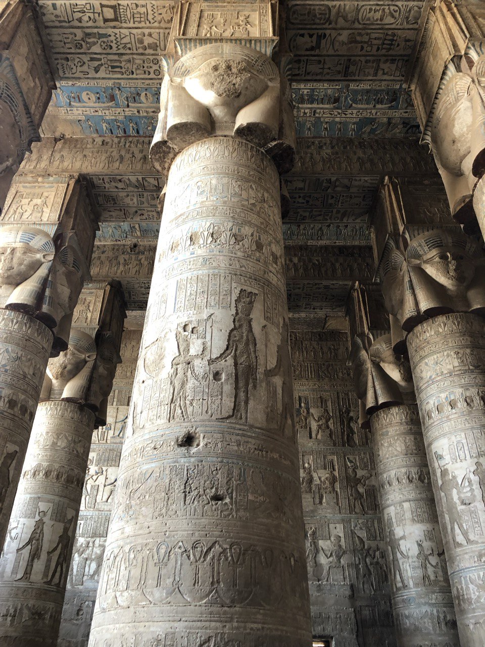 وهذا المعبد العظيم الذي كرس خصيصا لعبادة وتقديس الإلهة حتحور فرصة ذهبية لكل ملك منذ الأقدمين لكي يسجل نقوشه عليه. حتى يتقرب إلى المصريين من خلال معبودة الأمومة والحنان عندهم. ودلالة هذا مثلا منظر قيصرون ابن الملكة كليوباترا السابعة الضخم خلف المعبد، حيث يوثق تلك الحالة.