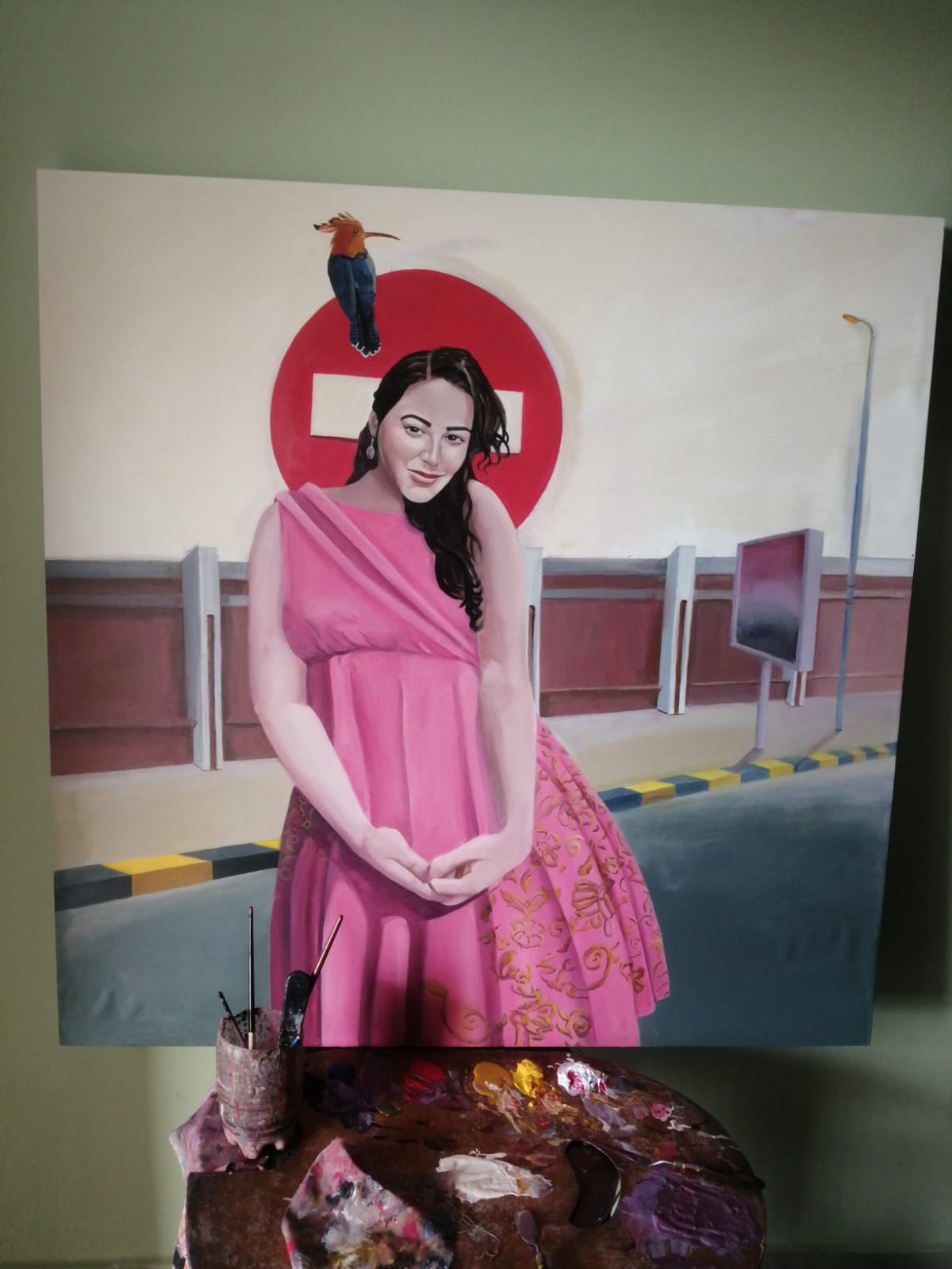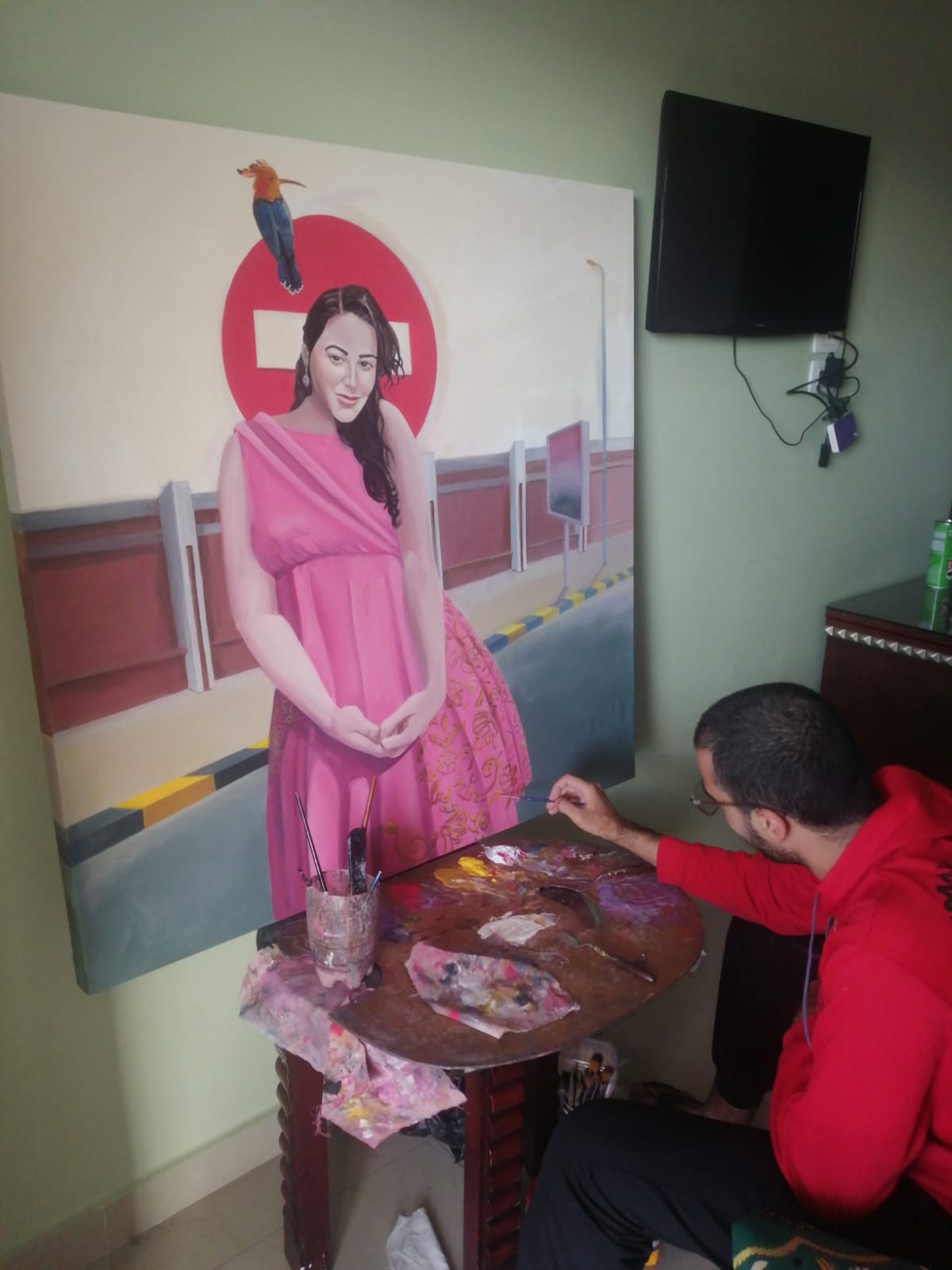 وتابع: استخدمت في لوحتي الفنية الأكريلك على توال. أما الموضوع فقد اخترت الألوان الهادئة مثل طبيعة المكان، رسمت فتاة ترتدي فستانًا ورديًا، مطرز بالذهبي فيما يشبه الزخارف الخشبية “الأويمة” التي يشتهر بها الأثاث الدمياطي. ووضعت في الخلفية علم مصر تعبيرًا عما رأيت من وطنية في هذا المكان.