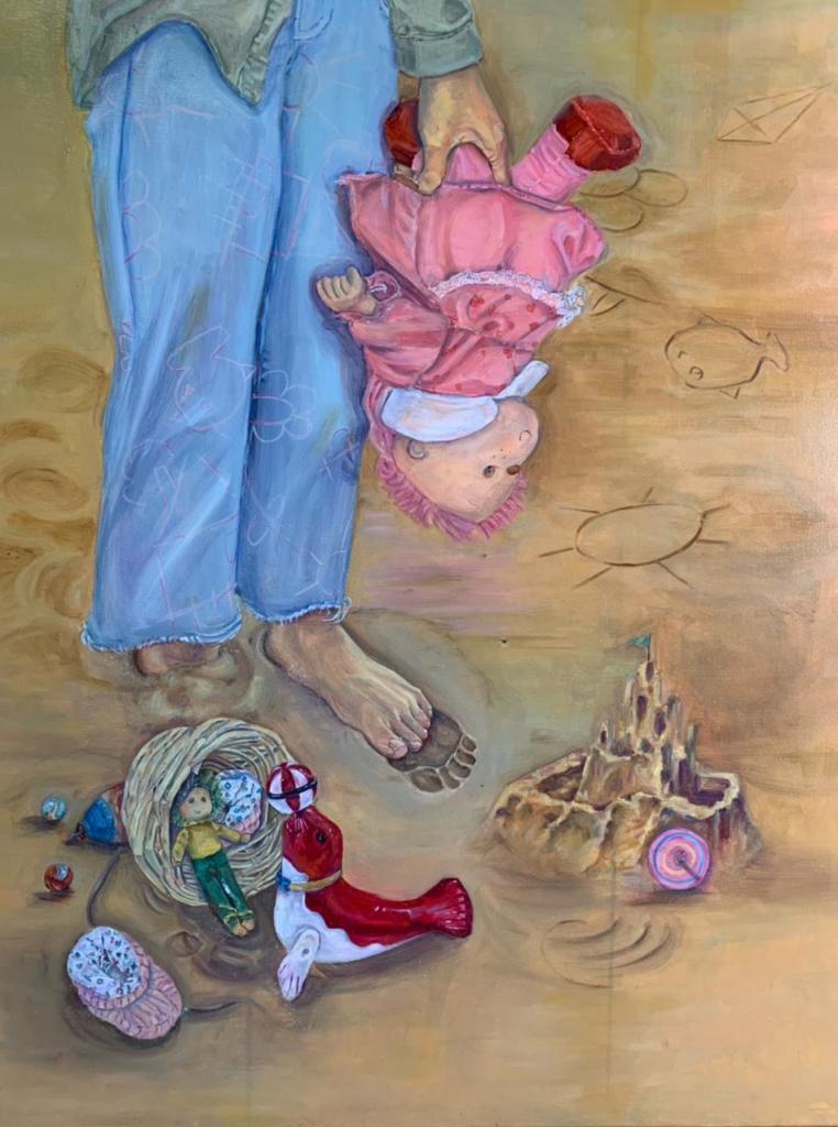 تشرح فكرة المشروع باستفاضة وتقول: هناك شيء ثابت في جميع اللوحات التي رسمتها بالمشروع، إذ إن هناك عروسة متواجدة في جميع اللوحات، وهذه العروسة كانت دائمًا ما ترافقني حين كنت صغيرة، وكنت دائمًا ما أصطحبها معي في جميع الأماكن، لذلك أردت أن ترافقني أيضًا في مشروع تخرجي، أما بالنسبة لبقية الألعاب الموجودة في الرسمة فهي موائمة لجو البحر الذي استعنت به نظرًا لأن طفولتي كانت وسط هذه المناظر.
