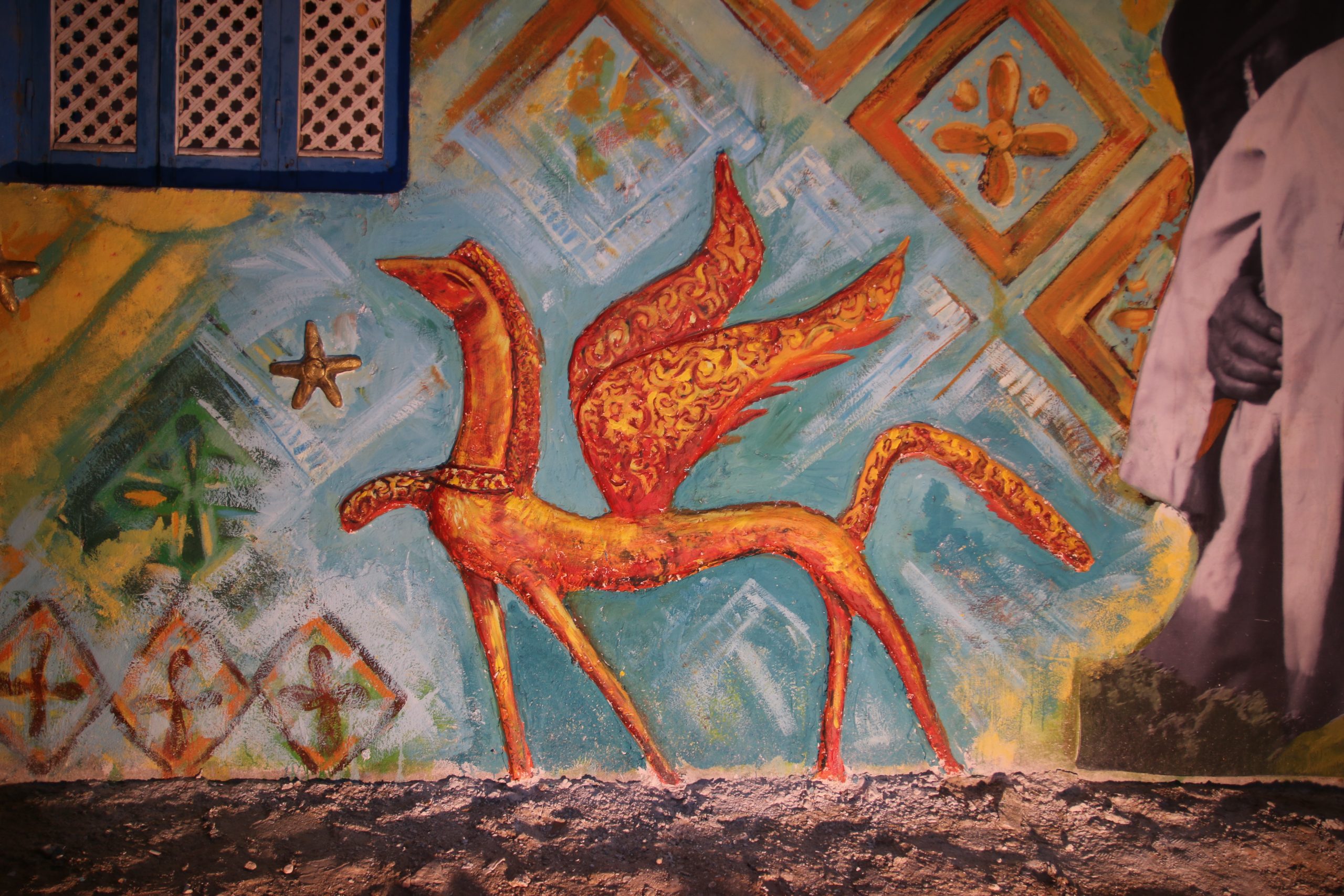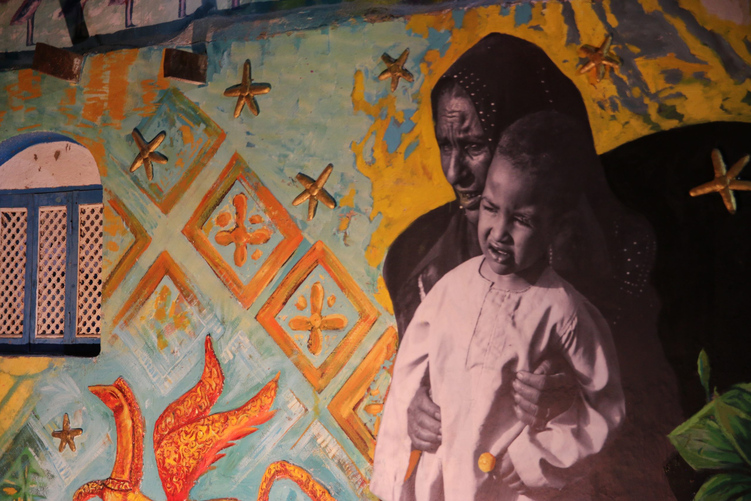 تحوت إله الحكمة عند المصريين القدماء، وبراق، وفتاة في جبال حميثرة في مولد قطب صوفي، ومعبد، وخيول في مرماح يتسابقون مثل نجوم عابرة. هذه هي مفردات الجدارية الصخمة التي نفذتها مؤسسة humans of upper Egypt، بمشاركة فنانين من الأقصر، وبدعم من نون آرت جاليري.