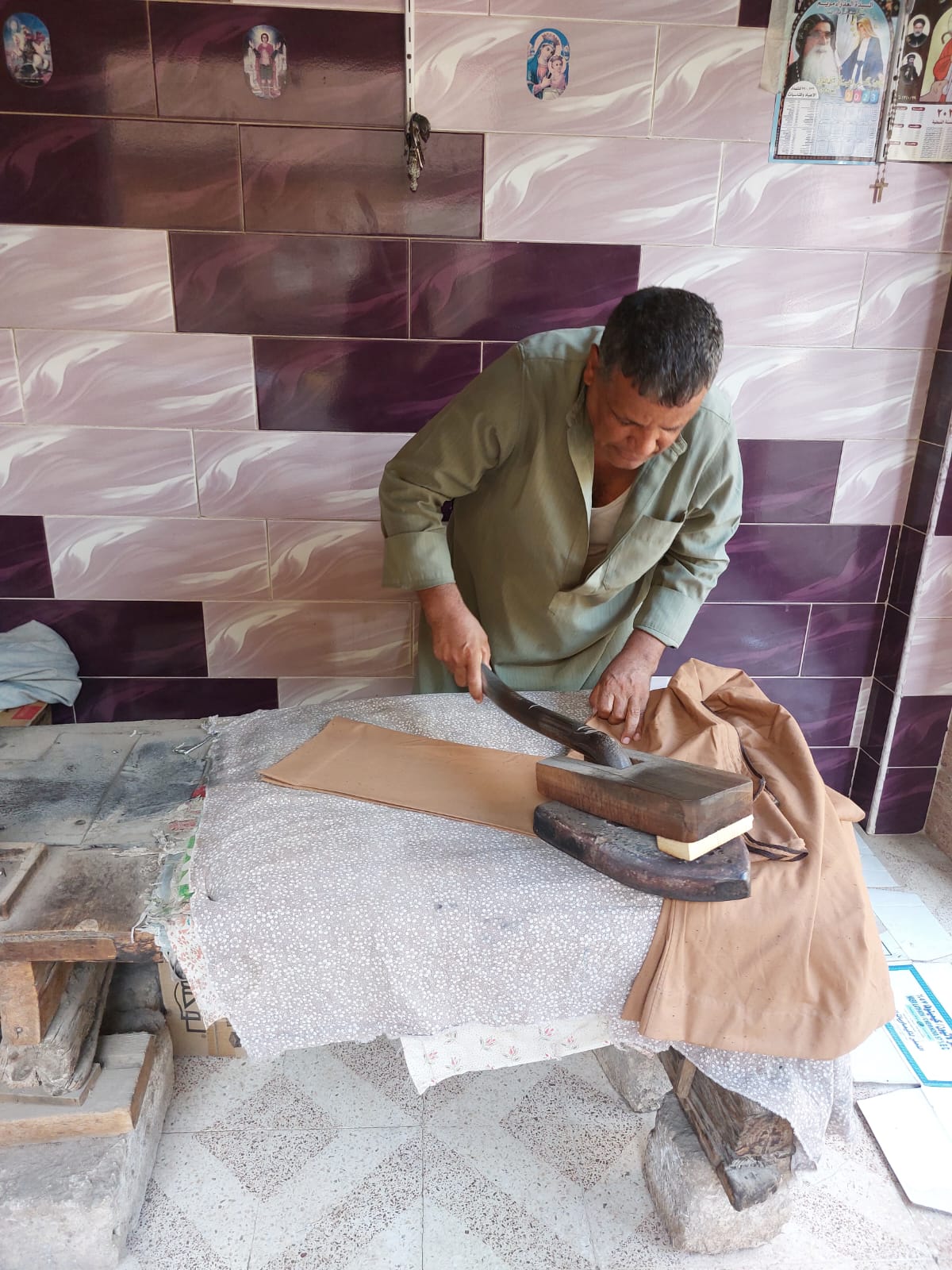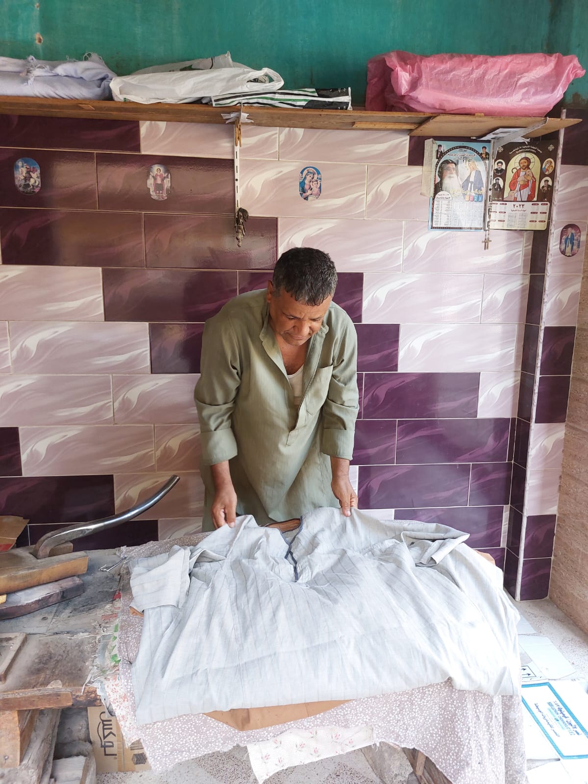 داخل محله الصغير الذي لا تتجاوز مساحته بضعة أمتار، تتراص أكوام الجلاليب الصوفية وقطع الملابس المختلفة بانتظار كيها بقدمه أو ذراعه. وتعد هذه الطريقة في الكي من المهن القديمة التي لا تزال موجودة في بعض محافظات الصعيد. لما تتميز به من قدرة على فرد الأصواف والجلاليب البلدية بدرجة أفضل من المكواة الكهربائية الحديثة.