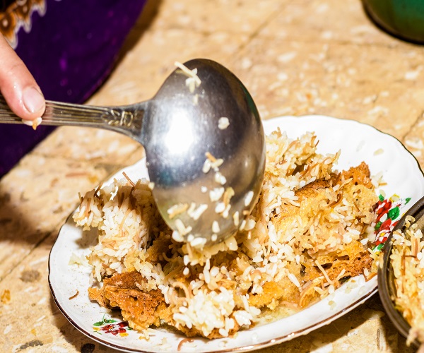 من عيش الـ”قرقوش” أو العيش الشمسي تحضر الفتة، بعد خبيز العيش يترك في الفرن الطين حتى يصبح عيش “مقرقش” ويمكن تناوله مع اللبن والشاي.