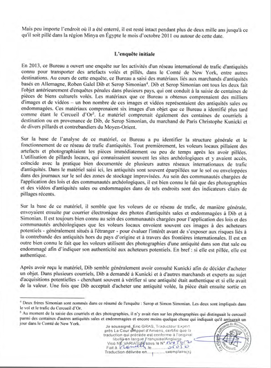 وتشمل أوامر الضبط والاعتقال الإخوة الثلاثة: سيمون (قبل رحيله)، وهاكوب، وسيروب. ويعلم القاضي أن تابوتين مصريين دخلا إلى أوروبا بشكل غير قانوني، ثم أحضرا إلى باريس عبر مستودع شركة كونيكي. (EURL) لعرضهما.