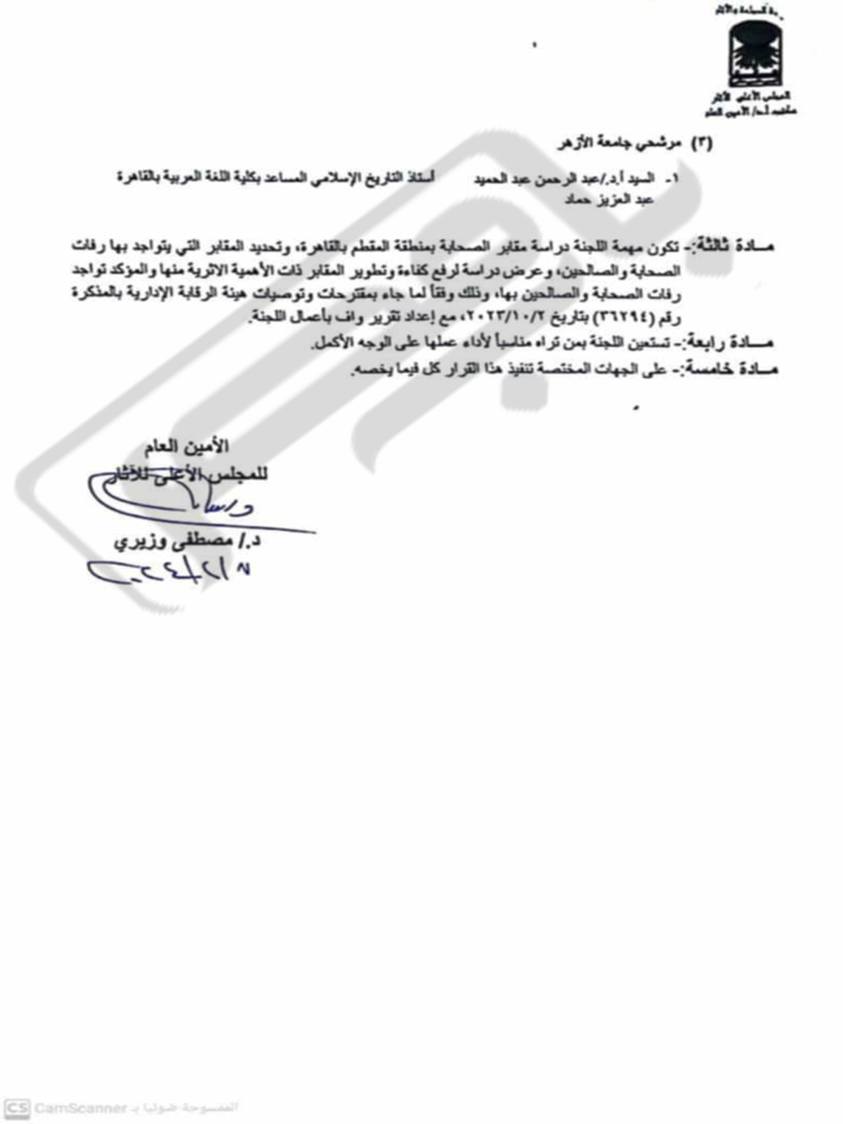 وتشير المستندات إلى أنه بتاريخ 7 فبراير 2024، أصدر الدكتور مصطفى وزيري، الأمين العام السابق للمجلس الأعلى للآثار، قرارًا بتشكيل لجنة لدراسة مقابر الصحابة بمنطقة المقطم. وتحديد المقابر التي تضم رفات الصحابة والصالحين. مع إعداد دراسة لرفع كفاءة المقابر ذات الأهمية الأثرية الموجودة بالمنطقة.