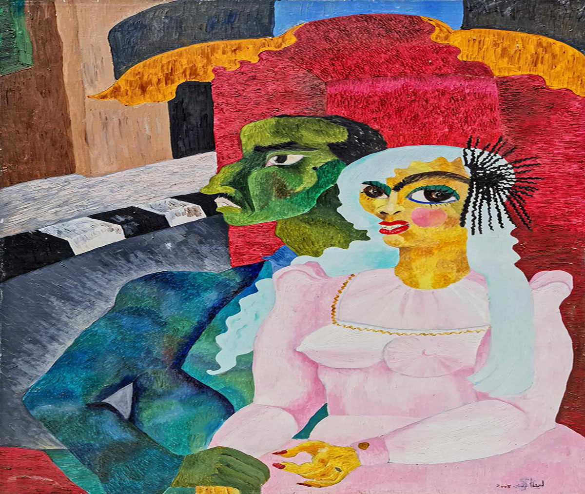 وتضيف، اللوحات التي أشارك بها تعكس الخصائص التي تميز أعمالي الحالية وأسلوبي الفني. حيث إنها ثنائية تواصل، تمثل حالة إنسانية خالصة من الفن التشخيصي متأثرة بفنون مصر القديمة التي طالما أبهرتني، وهي بمثابة كنز لا يفنى من الفكر والإلهام. ويظهر هذا التأثر في وضع الجلوس الأمامي الصدر وجانبي الوجه والأرجل وبالطبع في ملامح الوجه بشخوص لوحاتي.
