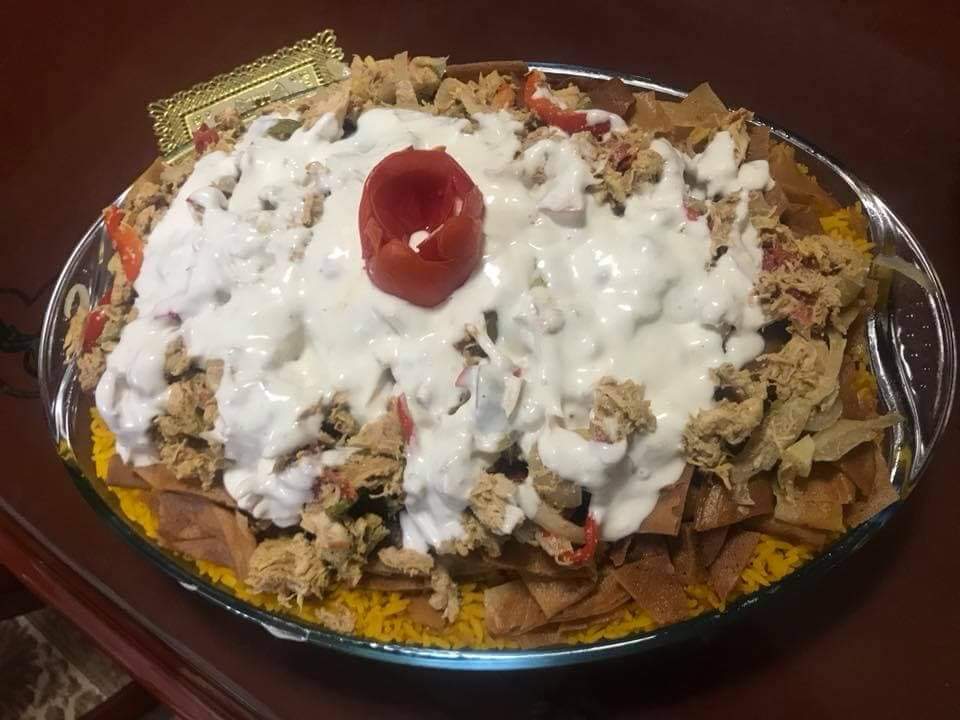 – لحمة مسلوقة + عيش سوري مقطع ومحمر في الزيت + كوب زبادي 1/4 كيلو + 3 ملاعق