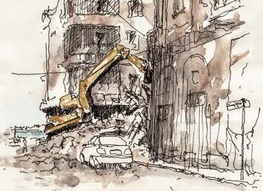 رسمت هذا المشهد في عام 2015 في مدينة الإسكندرية التركية القديمة (بحري) أثناء هدم منزل قديم. يقع المبنى على شارع ابو سفيان والكورنيش. يقف الآن بدلا منه بناية قي…
