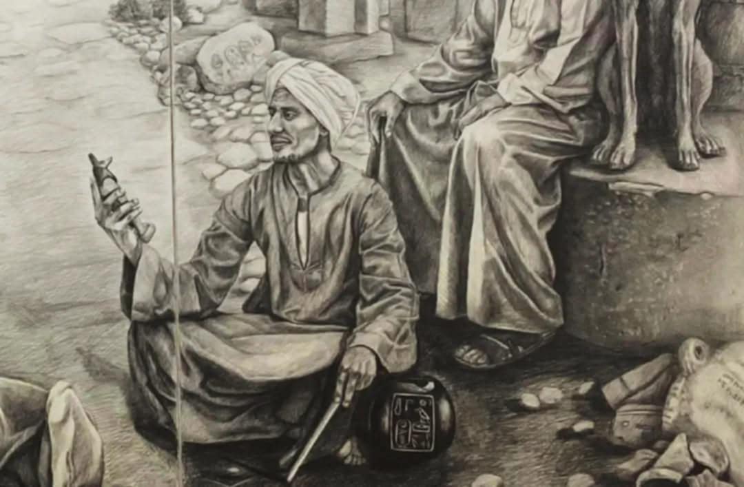 من بين اللوحات التي تم عرضها بالمعرض، ثلاث لوحات لأحمد يوسف، خريج كلية الفنون الجميلة قسم الجرافيك، عن حراس المعابد. يقول يوسف لـ«باب مصر»: “كان لنشأتي وسط الحضارة والتاريخ بجوار المعابد في قرية الكرنك، تأثير كبير على اختياري لمحتوى لوحاتي. حيث نشأت على مراقبة حراس المعابد وتصرفاتهم وإيمانهم الكامل بالحفاظ على هذه المعابد. كما أنهم من أكثر الأشخاص المهمشين في هذا الوسط”.
