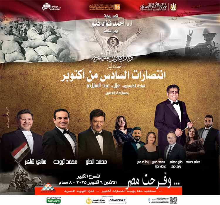 تنظم دار الأوبرا المصرية، احتفالية السادس من أكتوبر، بقيادة المايسترو علاء عبد السلام، وتحت رعاية الدكتور احمد فؤاد هنو وزير الثقافة.