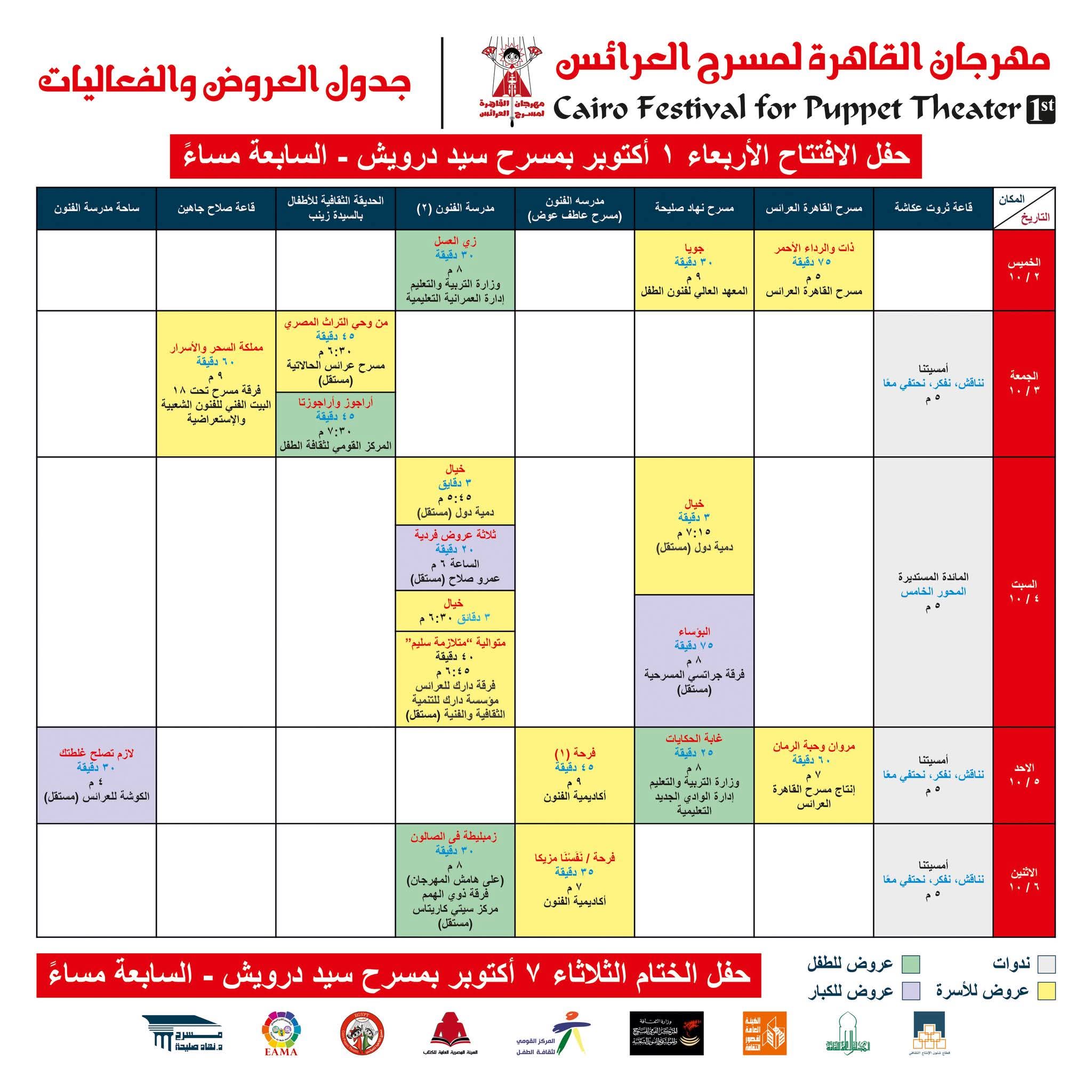 أعلنت إدارة «مهرجان القاهرة لمسرح العرائس» عن جدول العروض في دورته الأولى وهي دورة الفنان جمال الموجي، عن جدول أماكن ومواعيد الندوات العروض اليومية طوال فترة المهرجان والتي تفتح