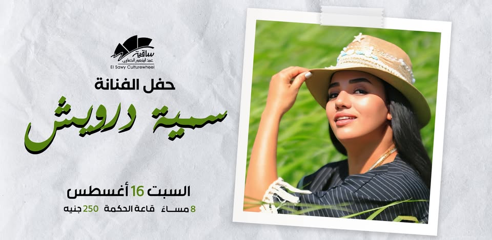 حفل الفنانة " سمية درويش " بساقية الصاوي المكان: قاعة الحكمة – ساقية الصاوي – الزمالك الوقت: الثامنة مساءًا