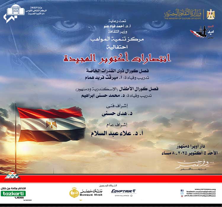 تقدم دار أوبرا دمنهور حفل فصل ذوى القدرات الخاصة لكورال أطفال الإسكندرية ودمنهور تحت رعاية أ.د. احمد فؤاد هنو وزير الثقافة، بمناسبة ذكرى انتصارات اكتوبر المجيدة