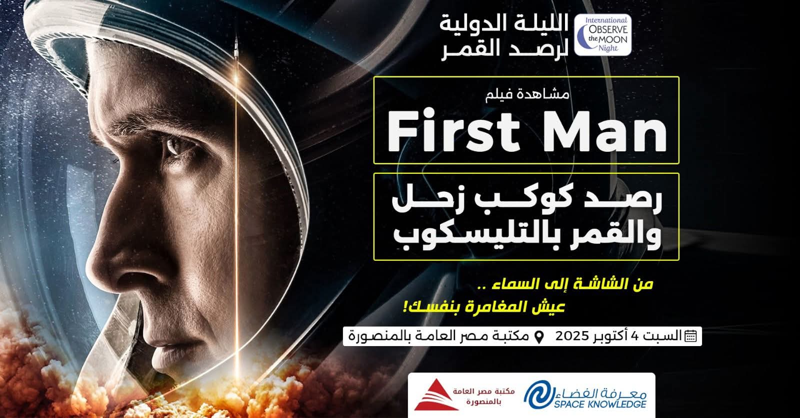 تنظم مكتبة مصر العامة فرع المنصورة، برئاسة الدكتورة رباب عبد المؤمن، بالتعاون مع مبادرة معرفة الفضاء، فعالية احتفال بالليلة الدولية لرصد القمر. تبدأ الفعالية بعرض الفيلم الأجنبي "First Man"…