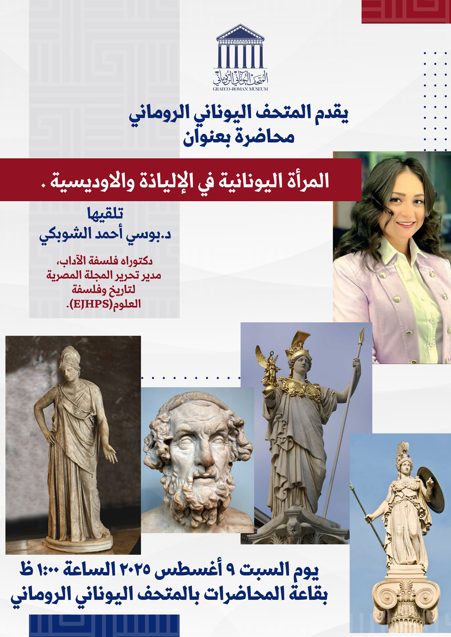 محاضرة بعنوان " المرأة اليونانية في الإلياذة والاوديسية" بالمتحف اليوناني، تقدم الندوة د.بوسي أحمد الشوبكي، دكتوراه فلسفة الآداب، ومدير تحرير المجلة المصرية لتاريخ وفلسفة العلوم(EJHPS) المكان: قاعة المحاضرات - المتحف