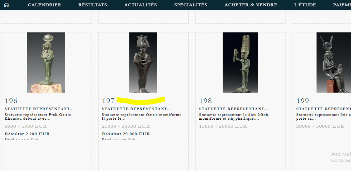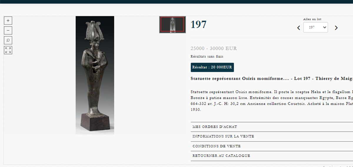 ترجع المرة الأولى إلى عرض التمثال المصنوع من البرونز الناعم ويحمل صولجان، إلى مزاد خاص عقده ورثة جامع آثار فرنسي يدعى تشارليز بوشيه في 24 أكتوبر 2012. ويصفه في الموقع الرسمي الخاص بعرض القطعة ضمن 122 قطعة تم بيعها، أنه يرجع إلى العصر المتأخر. تحديدا الفترة من عام 332 ق.م إلى عام 664 قبل الميلاد، بطول يصل إلى 30.2 سم. وكان قد حصل عليه بعد شراؤه من “بلات هاوس” في عام 1950. وتم عرضه بمبلغ محتمل يتراوح من 25 ألف يورو إلى 30 ألف يورو، لكن تم بيعه مقابل 20 ألف يورو. وتم عرضه للبيع للمرة الثانية في عام 2018 بدار سوثبيز وكريستيز بلندن. وتضمن وصفه أنه يرجح أن يعود لعصر الأسر من الـ26 إلى 30، ويعود تاريخه في الفترة ما بين 664-342 قبل الميلاد.