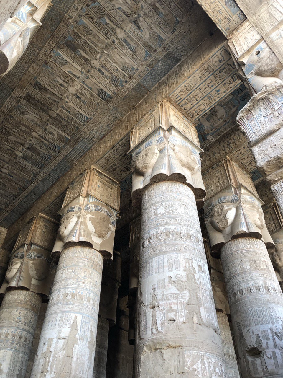 في زيارتك للمعبد، تستقبلك في بداية الأمر ساحة واسعة. ثم يطل المعبد في الأفق القريب بتيجانه الحتحورية الفريدة التي تشكلت على رأس الإلهة حتحور معبودة المعبد الرئيسية والتي تميز بها المعبد دون معابد مصر القديمة كلها. ثم تدخل إلى المعبد عبر ممر صاعد حتى قدس الأقداس. وفي نفس الوقت يهبط السقف عند كل خطوة تخطوها داخل المعبد وفي نفس الوقت يتضاءل حجم الضوء الداخل إلى المعبد حتى الظلمة الكامل بالقرب من قدس الأقداس. ثم يهبط شعاع ضوء صغير في هذا الركن المقدس من المعبد على تمثال عبادة الإلهة. تلك هي الحالة التي تدخل بها إلى المعبد وتعيشها معه بشكل استثنائي. ينفرد هذا المعبد بكثرة الغرف داخله وكثرة المباني داخل بهوه الرئيسي لذلك يطلق عليه مدينة المعبد، كأنه مدينة كاملة بتفاصيلها. ويمكن فهم تلك الطبيعة المعمارية في هذا المعبد من خلال نظرة واحدة من أعلاه لترى فيها كمًا هائلا من التفاصيل المعمارية وكأنه مدينة مصغرة.