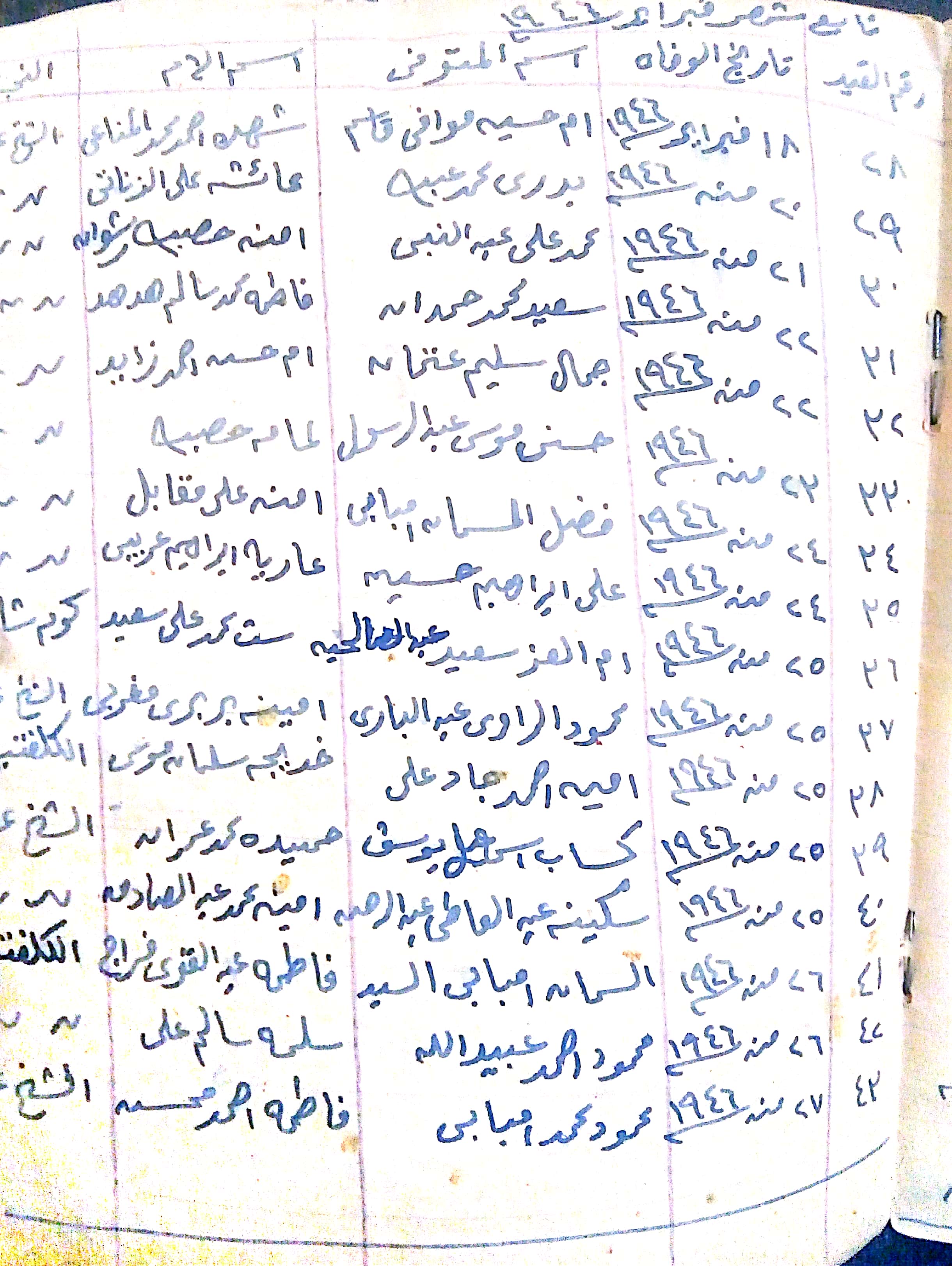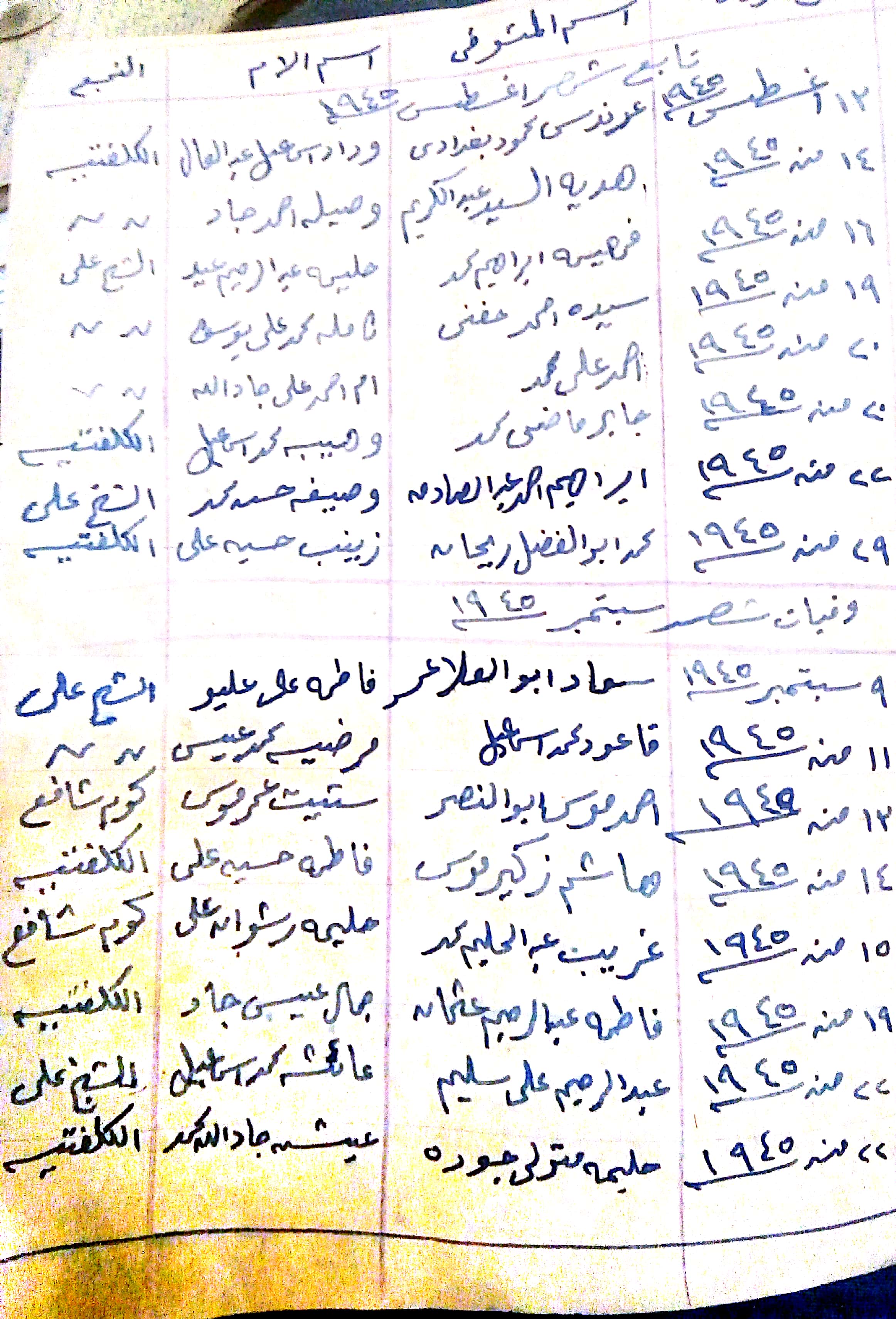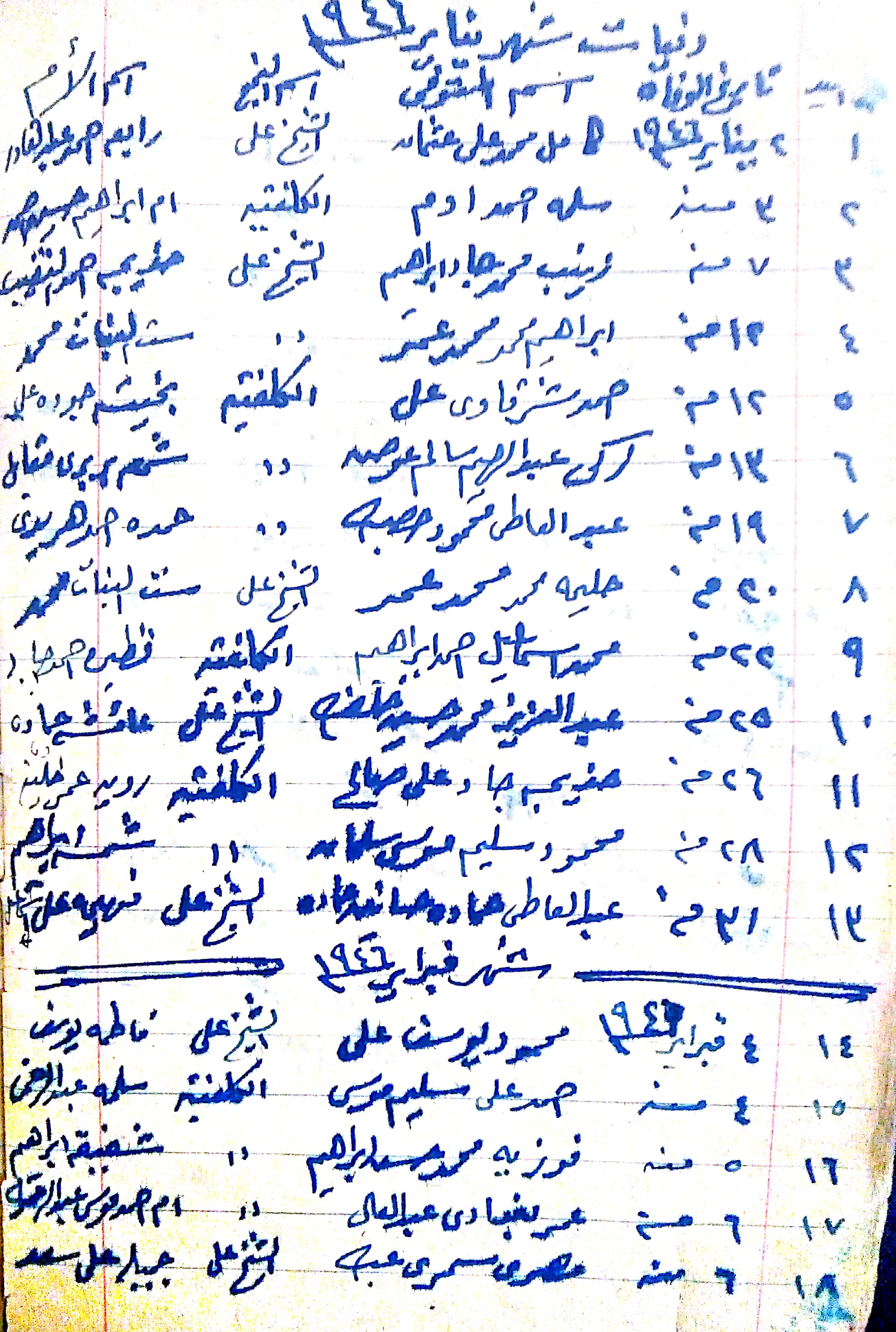 وبلغ عدد وفيات القرية بتوابعها 137 شخصا، ووصل في عام 1945 إلى 160حالة وفاة، وفي عام 1947سجلت القرية وفيات 62شخصا، وفق دفاتر التسجيل التي يحتفظ بها الجد طه منذ فترة عمله وعمل أبيه، تلك الأرقام التي يتضح قيمتها حين تعلم أن تعداد القرية بتوابعها يتراوح بين 3 إلى 4 آلاف نسمة.