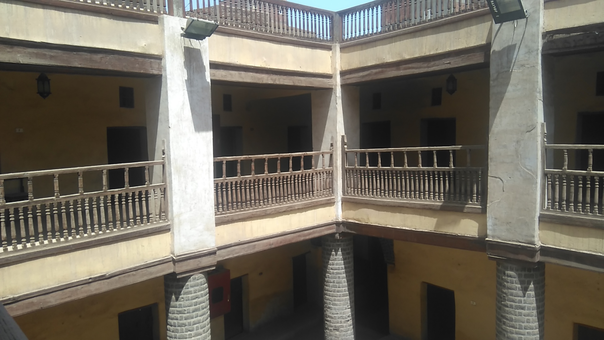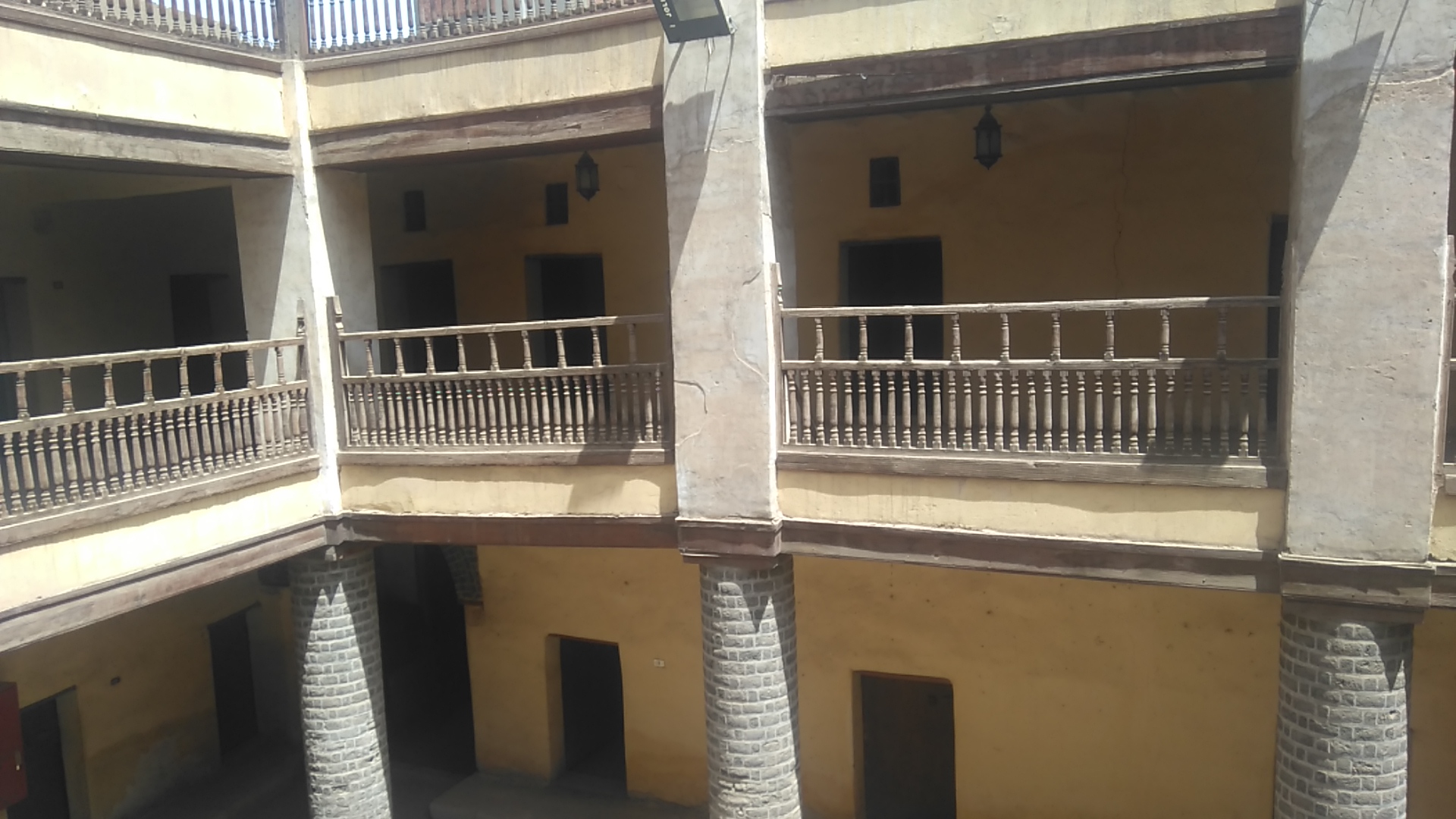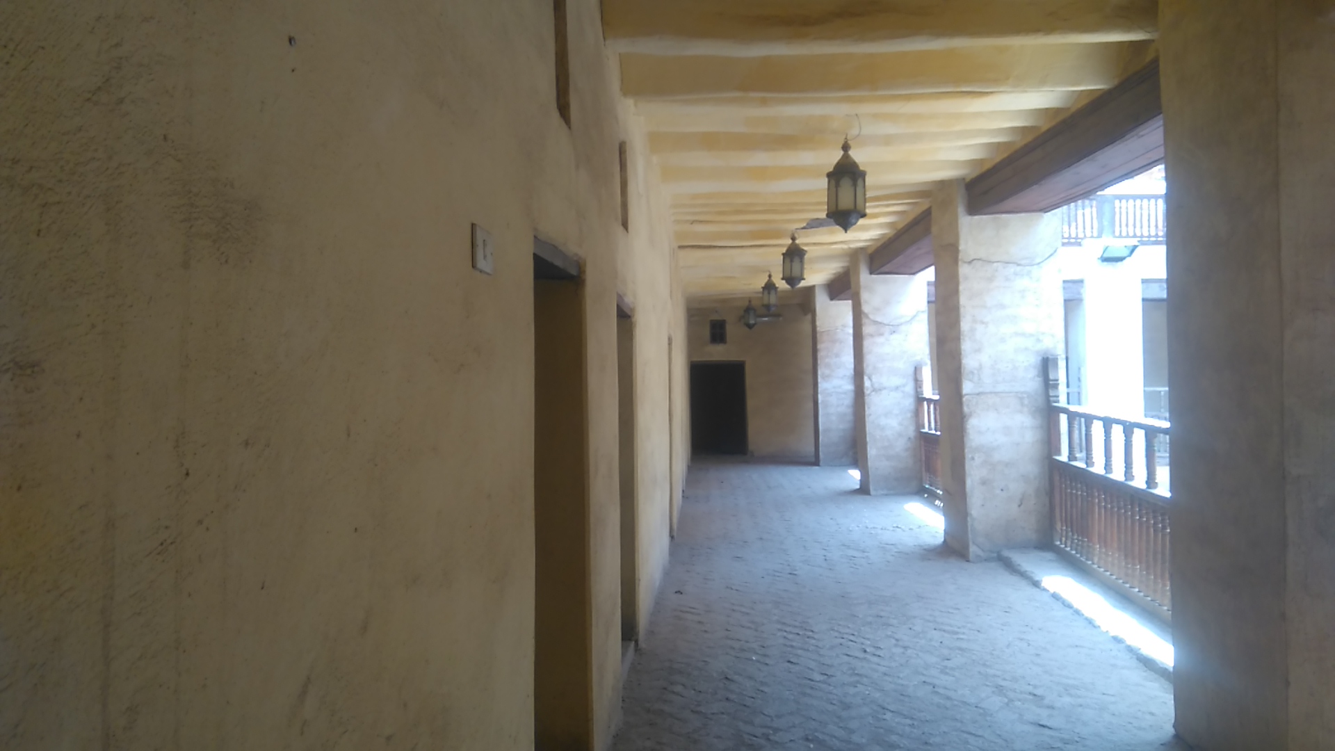 عبارة عن مساحة مستطيلة الشكل (1 7.5 × 10 أمتار) وهو مكشوف سماوي يحيط به من جميع الجهات ظلة مسقوفة من خشب النخيل، ترتكز على عشرة أعمدة دائرية، وخلف الظلة تقع أبواب الحواصل.