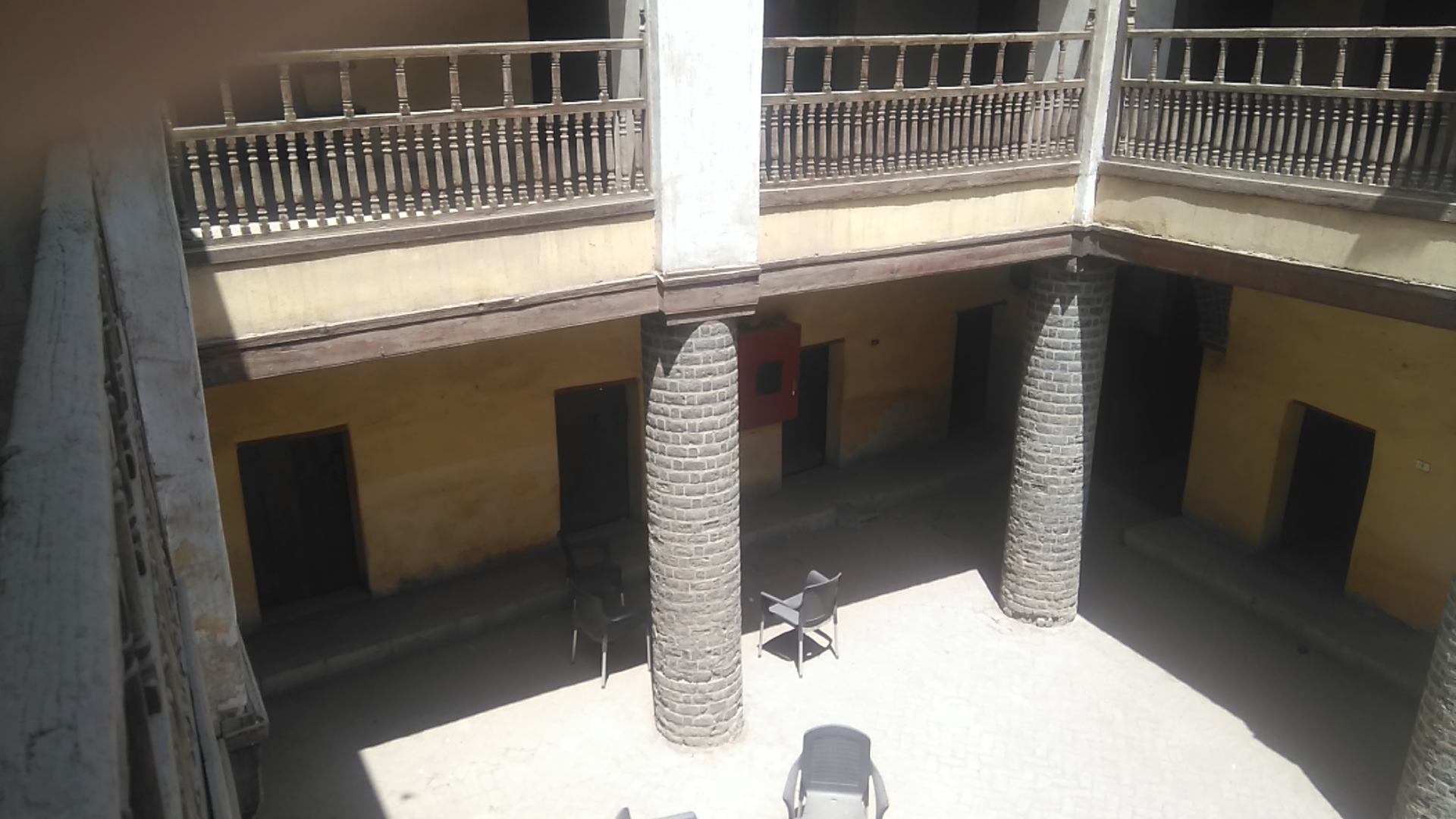 في منتصف الشارع العتيق وقفنا أمام باب خشبي مرتفع يحيط به من الخارج زخرفة تاريخية، وإذا رفعت عينيك قليلا شاهدت شرفة خشبية مكونة من شبابيك مخرمة، إنها وكالة شلبي.