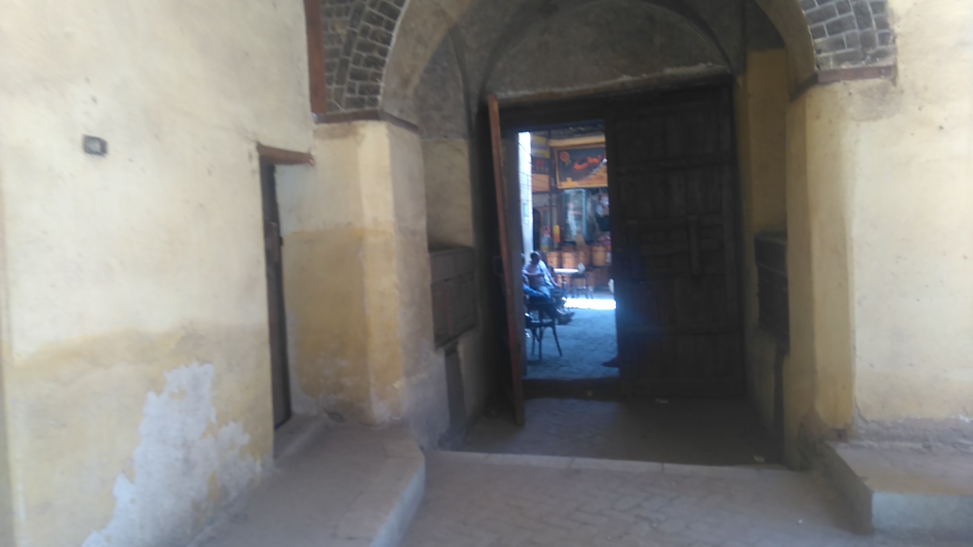 بعد مرورك من باب خشبي مرتفع تجد مدخل الوكالة، وهو عبارة عن فتحة مستطيلة الشكل (2.90 1 x 2متر) يعلوها قبة خشبية داخلها نجمة ثلاثية الشكل، صممت بهذا الارتفاع لتستطيع الجمال المحملة بالضائع المرور منها، لتصل من ذلك المدخل إلى صحن الوكالة.