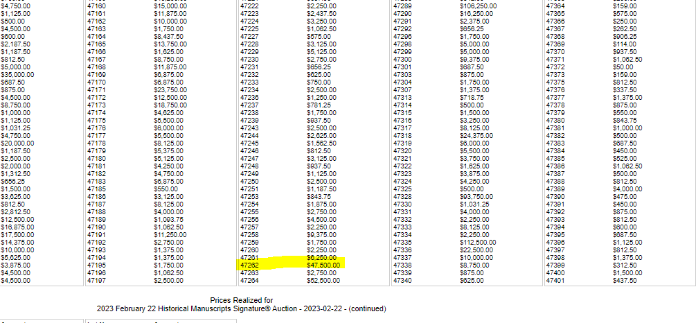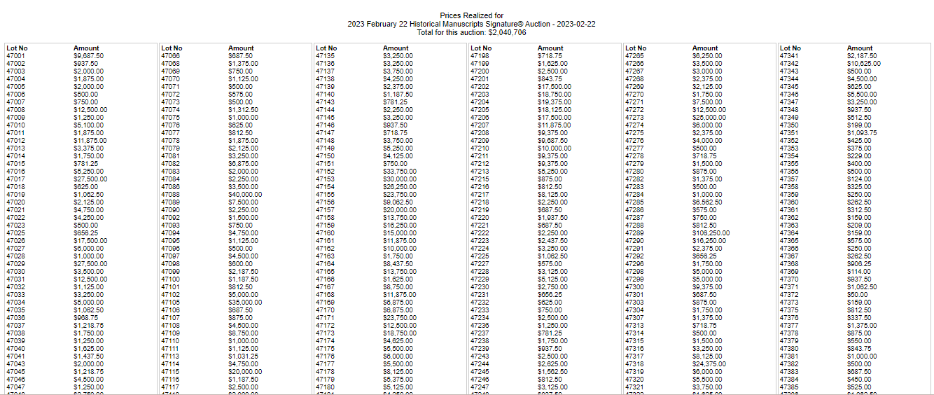 حملت القطعة رقم 47262، ضمن مجموعة مزاد المخطوطات التاريخية بتاريخ 22 فبراير 2023، وحقق إجمالي هذا المزاد 2040706 دولار.