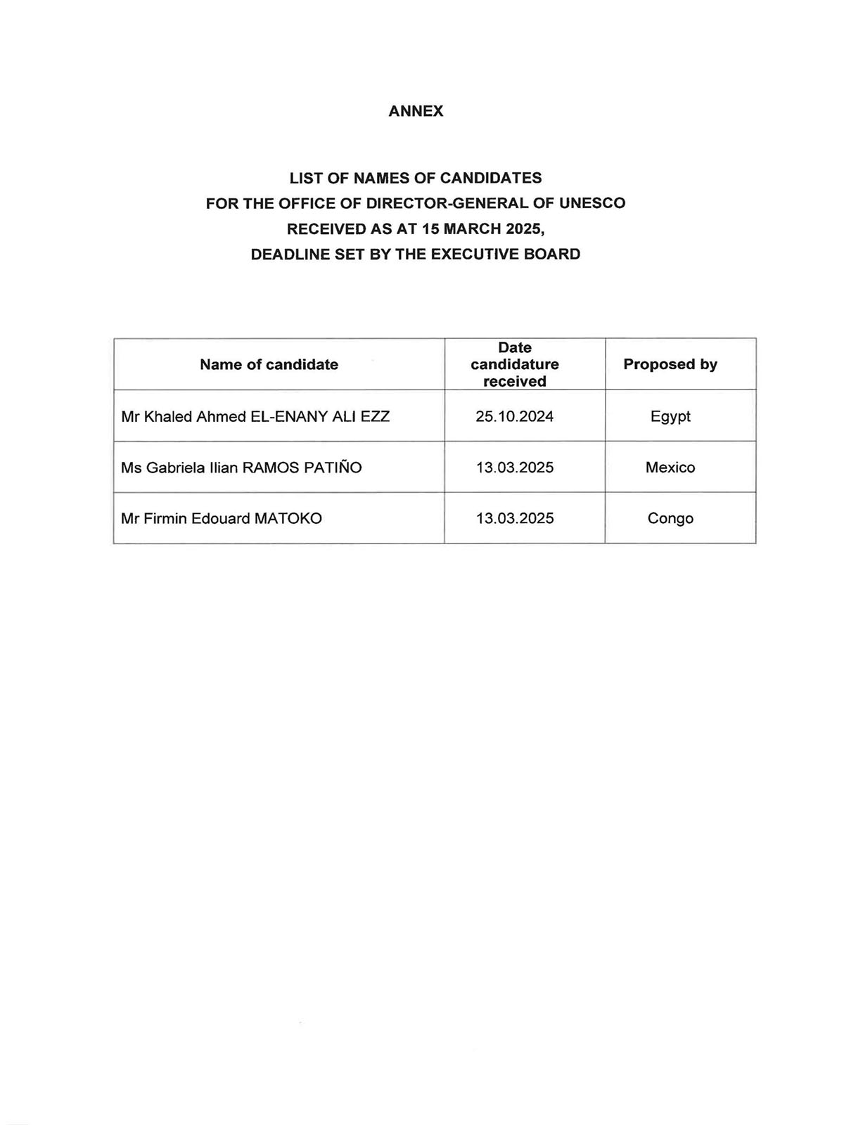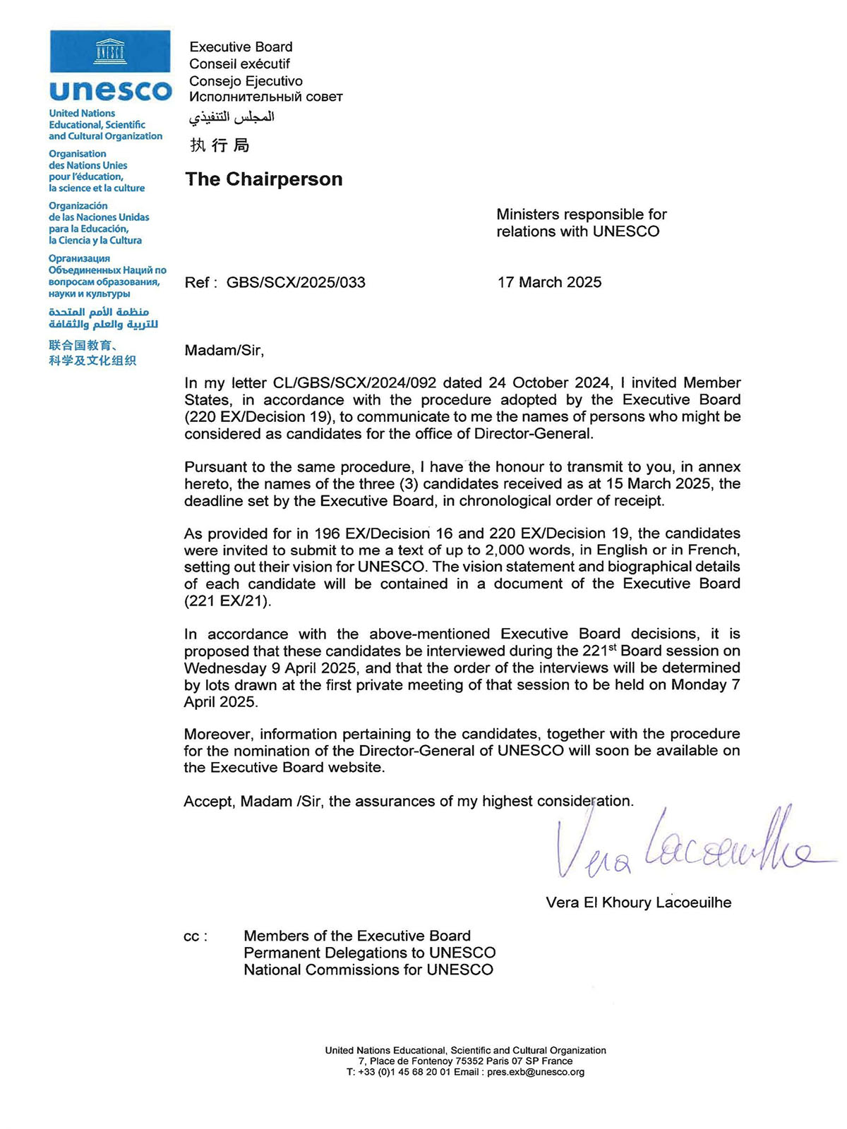 ووفقًا لخطاب صادر عن المجلس التنفيذي لمنظمة اليونسكو في 17 مارس الجاري، تم اعتماد المرشحين بشكل رسمي، على أن يقدموا خطاب ترشحهم الرسمي في حدود 2000 كلمة. واقترح المجلس التنفيذي إجراء مقابلات مع المرشحين يوم الأربعاء 9إبريل المقبل خلال الدورة 221 لاجتماع المجلس.