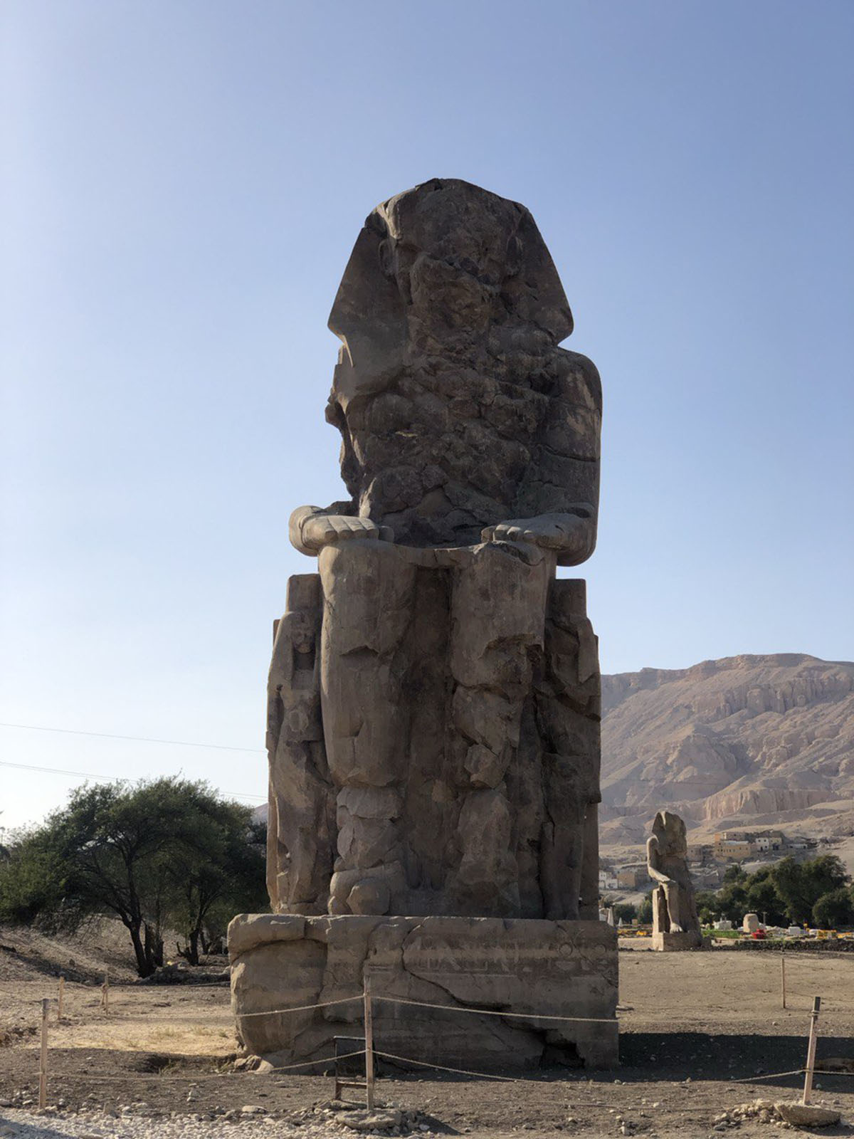 على ناحية أخرى من المدينة يقف تمثالي ممنون، وما يميزهما دون غيرهما من التمثالين في بر الأقصر، أنها ينخرطان في المكون الإنساني والعمراني في المنطقة بشكل منسجم كبير. وسط رقعة زراعية خضراء تعكس فصلا من فصول الحضارة القديمة. تمثالي ممنون اللذان يظهران في وضعية ملكية. حيث يجلسان على كرسي العرش وينظران ناحية الشرق هما في الأساس للملك أمنحتب الثالث. كانا جزءا من معبد جنائزي ضخم في تلك الرقعة، لكن بقاء التمثالين فرض على المخيلة الشعبية أنهما يحميان البر الغربي كله، خاصة في وضعهما المهيب القوي. واسم ممنون هذا يرجع إلى الإغريق حيث اعتقدوا أنهما للبطل الإغريقي ممنون الذي قتل في معركة طروادة. خاصة أنهم كانوا يسمعون منهما أصواتا حزينة عندما تهب الرياح. وسبب تلك الأصوات أنها كانت تخرج من بين تلك الشقوق في بدن التمثالين، الشقوق التي تسببت بها الزلازل كانت هي الكاتب الأول لأسطورة التسمية المنتشرة بين الناس الآن.