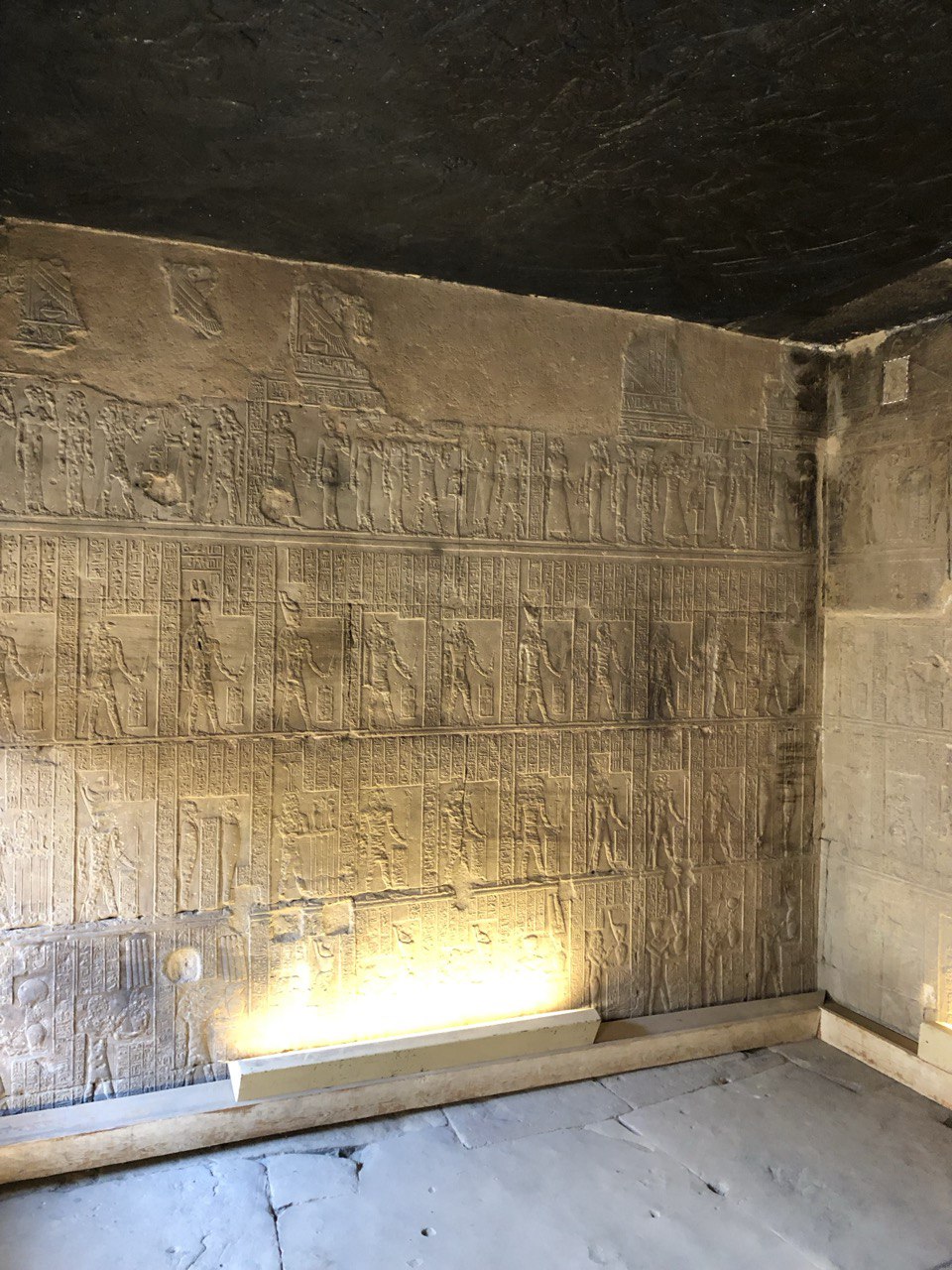 فعلى أول الطريق تدخل إلى المعبد الضخم، الذي يُلقي في قلبك الرهبة والمهابة. وأثناء زيارة المعبد، ستنتقل من الفناء الخارجي عبر قاعة الأعمدة إلى ممر يؤدي بك في النهاية إلى قدس الأقداس. يرتفع مستوى الأرض تدريجيا كعادة المعابد المصرية القديمة، فقدس الأقداس لا تصل إليه إلا في حالة صعود. بينما تصبح الأسقف أقل ارتفاعا كما تصبح أكثر قتامة حيث تفسح الساحات المفتوحة ذات الأسقف وقاعات الأعمدة المجال للغرف الداخلية المظلمة. عند قدس الأقداس ينزل عمود ضوء صغير واحد فقط لإلقاء النور على تمثال عبادة الإله. الذي يكفي فقط لرؤيته في منزله أو بالأدق في قدسه.