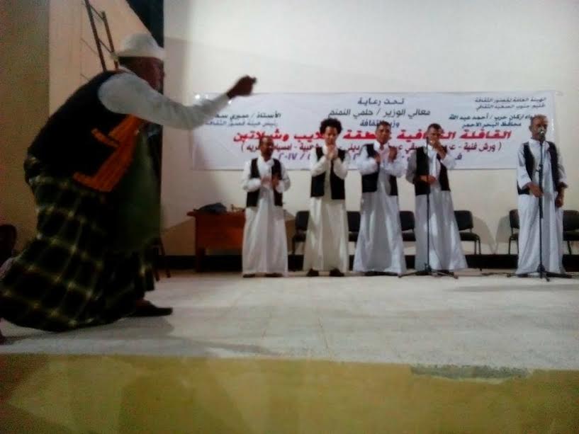 كما عرضت فرقة شلاتين أمس الجمعة، عرضا فنيا يحاكى التراث الشعبى للمنطقة، بحضور الباحث سعد فاروق، رئيس الإدارة المركزية لإقليم جنوب الصعيد الثقافى، وعلا بغدادى مدير عام ثقافة البحر الأحمر .