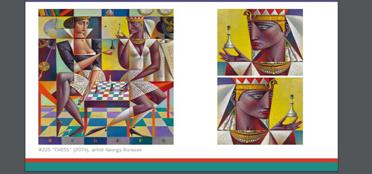 أرسلنا مقطع الفيديو والصورتين، للفنان الروسي جورجي كوراسوف، لمعرفة إذا ما تم استخدام لوحاته في فيديو المعهد الأوروبي للتصميم بموافقة منه. وهما اللوحة الأولى المستخدمة على عبوة المياه الغازية عام 2019، تحمل وجه سيدة من لوحة “الشطرنج” لجورج كوراسوف، والتي تحمل رقم (225) لعام 2015.