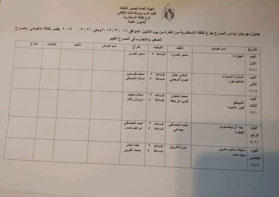 نشرت إدارة إعلام فرع ثقافة الإسكندرية على صفحتها الرسمية على الفيس بوك أمس الجدول النهائي للعروض مهرجان نوادي المسرح بفرع ثقافة الإسكندرية، والذي يقام من يوم 18 حتى 31 مارس 2019 بقصر ثقافة الأنفوشي.
