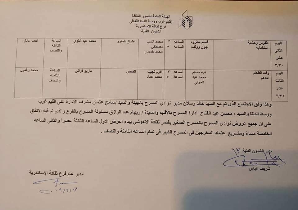 وقد تقرر ذلك وفقا للاجتماع الذي تم مع كل من خالد رسلان مدير نوادي المسرح بالهيئة، سامح عثمان مشرف الإدارة على إقليم غرب ووسط الدلتا ومحسن عبد الفتاح إدارة المسرح بالإقليم وريهام عبد الرازق مسؤول المسرح بالفرع وإبراهيم رمضان مدير مسرحي الأنفوشي، الذى تم فيه الاتفاق على أن جميع عروض نوادى المسرح بالمسرح الصغير بقصر ثقافة الأنفوشي.