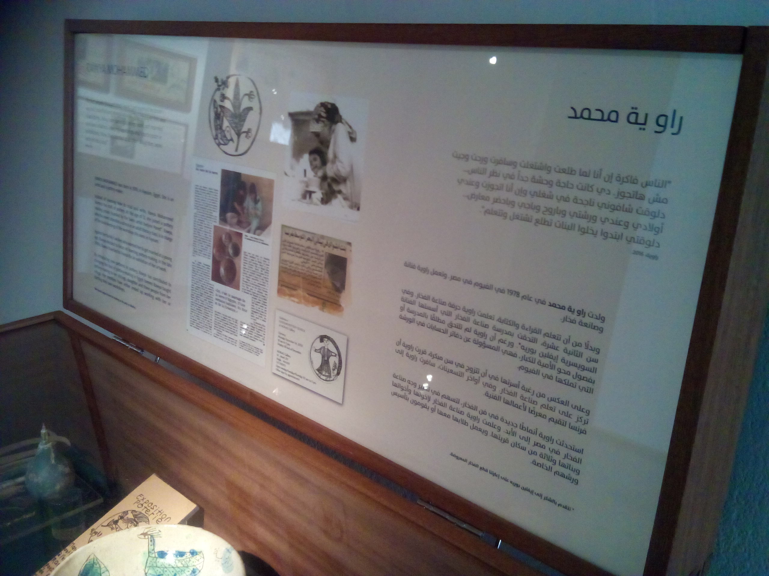 ويعرض أيضا قصة راوية بنت الفيوم التي لم تسعى لتعلم القراءة والكتابة، ولكنها سعت لتعلم صناعة الأواني الفخارية عند سن الثانية عشر ومن ذلك الحين ألهمت العديد من النساء للعمل بتلك الحرفة اليدوية، وأنشأت ورشة صغيرة في منزلها لتلك الحرفة، وقد أسهمت راوية في تغيير صناعة الفخار في الفيوم.