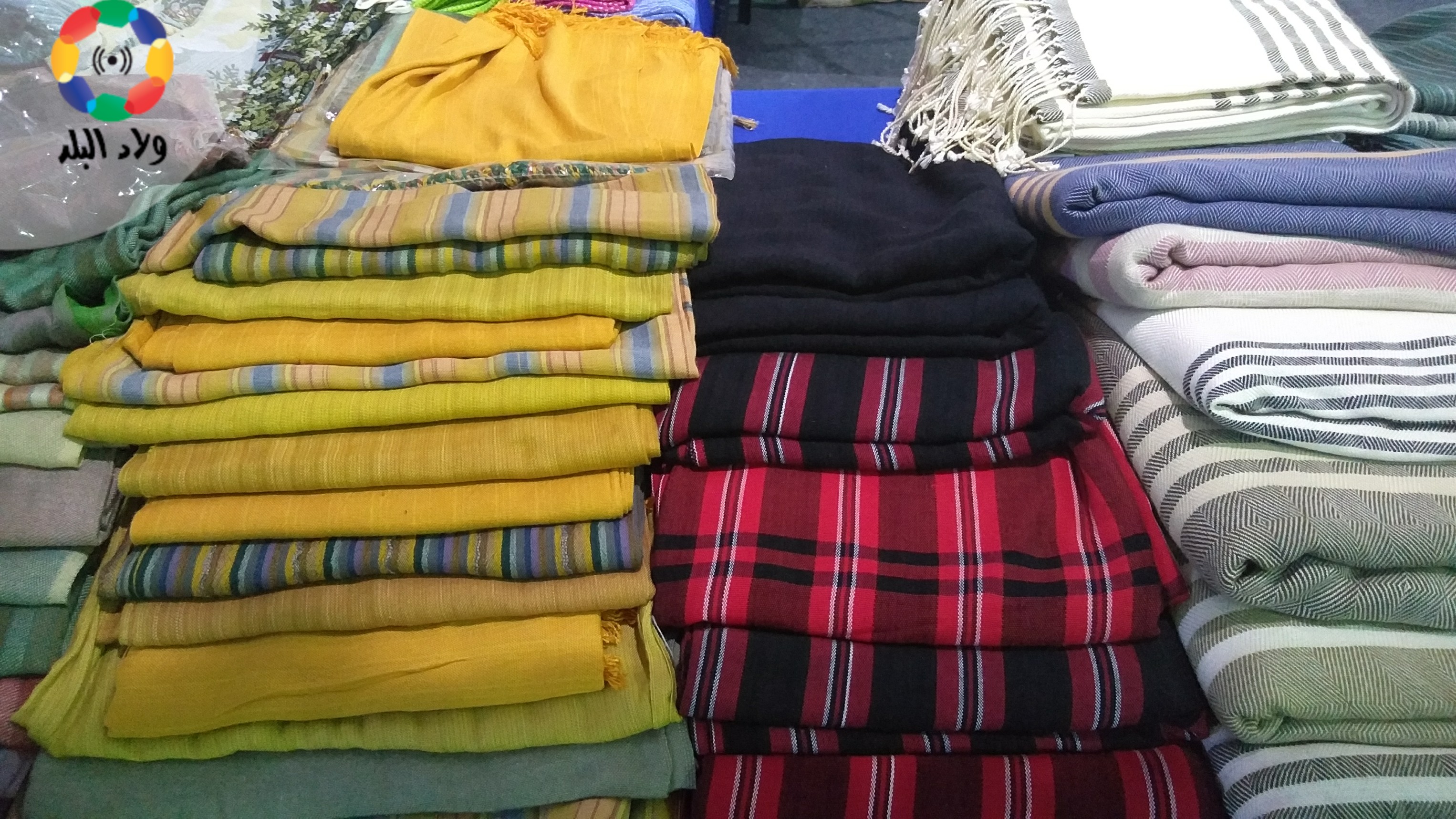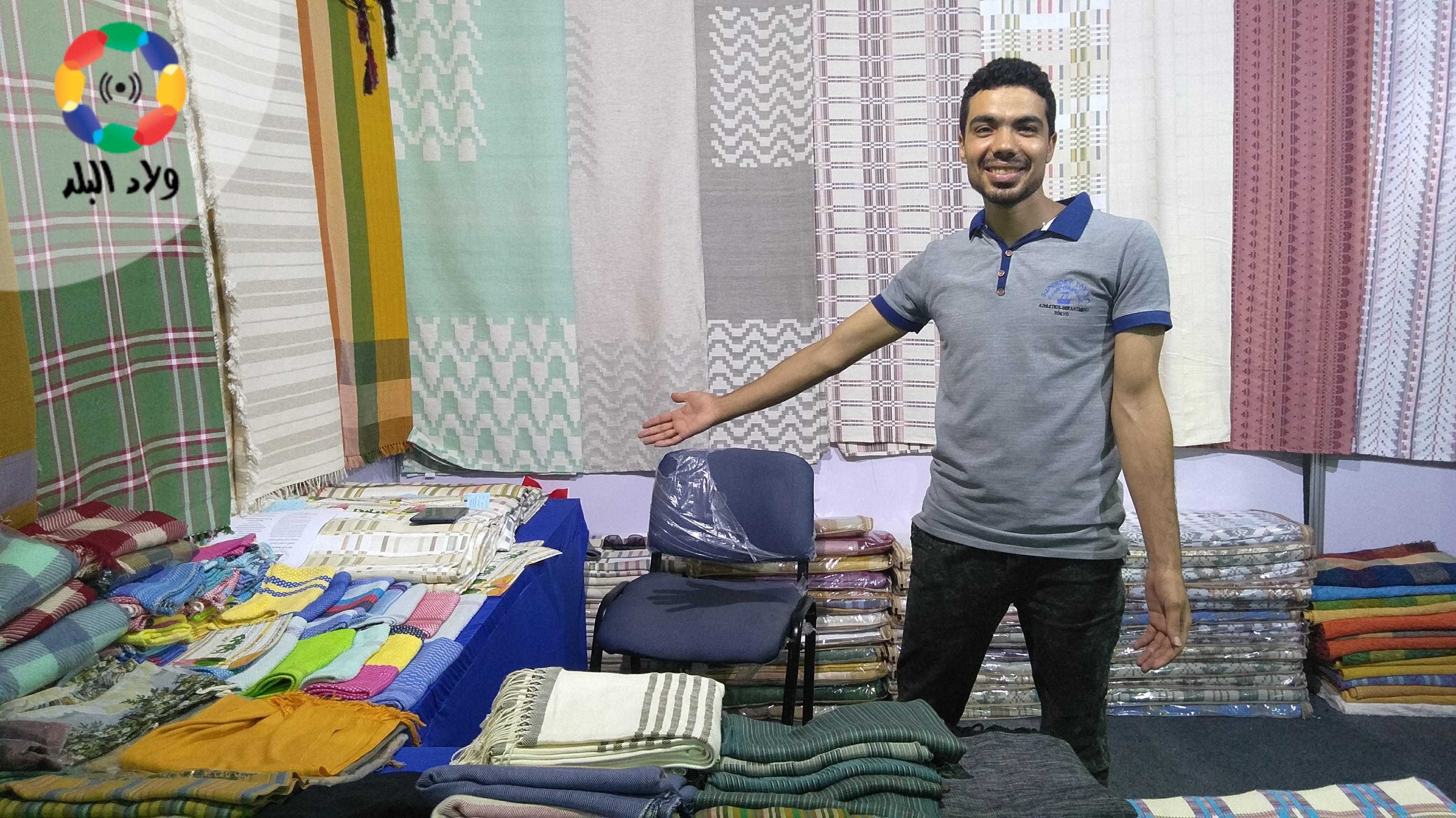 أما عن ركن معروضات أخميم يوضح حاتم السيد، مدير تسويق في مؤسسة الفراعنة منسوجات أخميم اليدوية بمحافظة سوهاج،”أهم المعروضات لدينا هي الكوفرتات يدوية الصنع من القطن، الفوط، الشال الحريمي”.