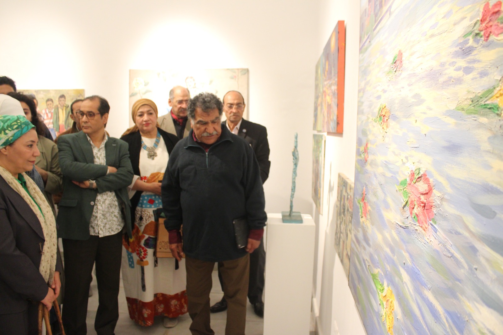 كما أهدى بعض المعجبين للفنان محمد عبلة، باقات الورود. وحرصوا على التقاط الصور التذكارية معه، ومع اللوحات الفنية التي شهدت إعجابا من الحضور.