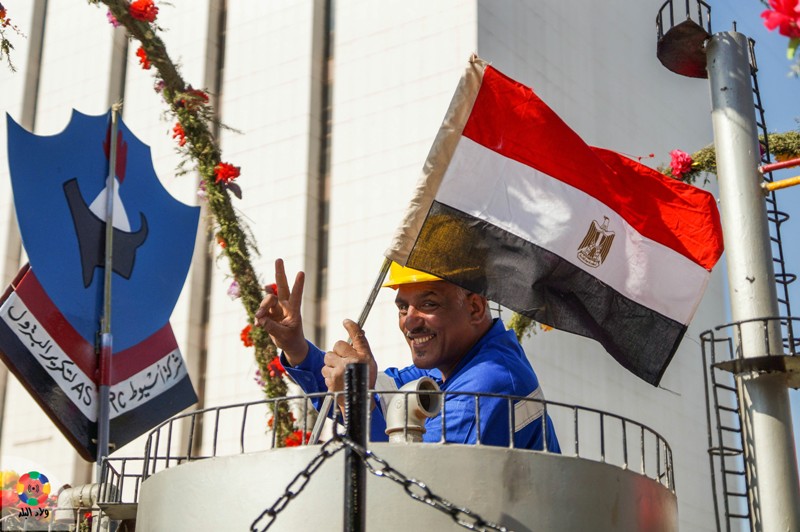 أحد العاملين بشركة البترول يرفع علم مصر خلال الاحتفالات