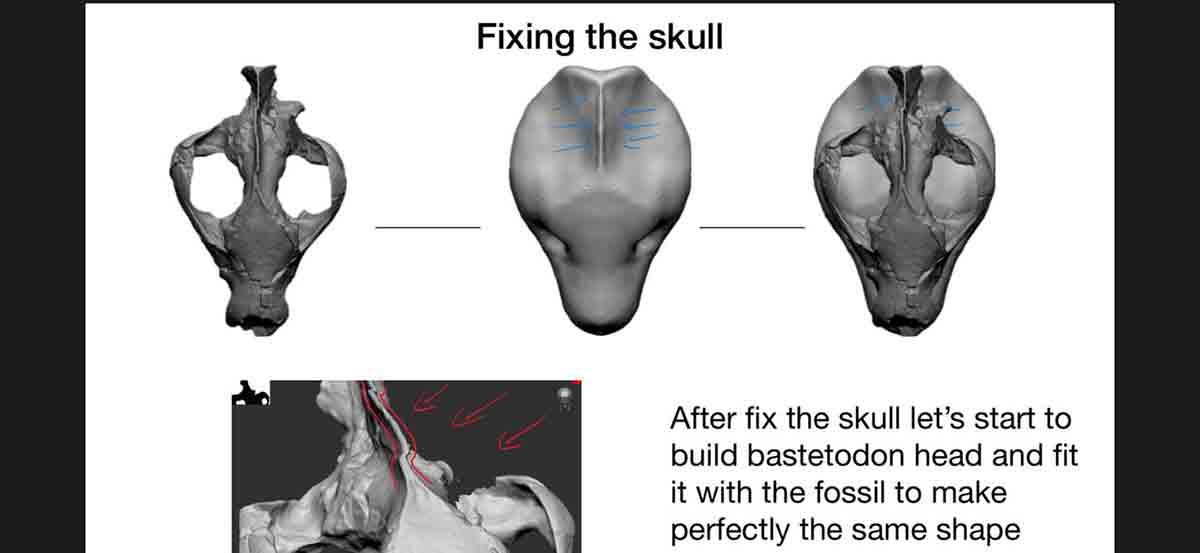 وبحسب مرسي، كان هناك تحدٍ آخر وهو شكل الجمجمة ووضع التصور لها. يقول: “لأنني الوحيد الذي أعمل كمصمم علمي مصري ولا يوجد لدي نسخة مسبقة لتقلديها، أخذ ذلك وقتًا طويلا في البحث والدراسات التشريحية وغيرها”. ويكمل: لقد وجدنا الجزء العلوي فقط من جمجمة “باستيتودون”. أما الجزء السفلي فغير معروف، وهو ما يثير الكثير من الأسئلة مثل: كيف كان يبدو؟ وما شكل الأسنان والأضراس؟ لأن كل نوع له شكل خاص لتلك الأسنان. ولكننا لكي نصل إلى شكله، ألقينا نظرة على ابن عمه من فصيلة “hyaenodonta” وهو “hyaenodon”، الذي يمتلك جمجمة كاملة تقريبا وهو مشابه له جدا. لذا كان مرجعًا جيدًا خاصة فيما يخص الفك السفلي.