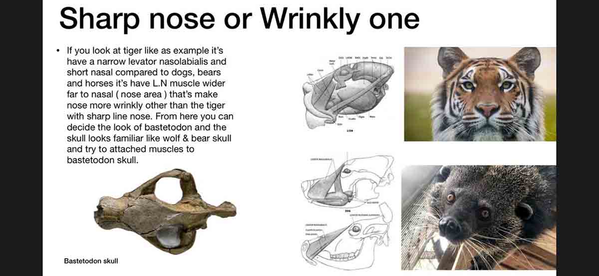 وبالنظر إلى جمجمة الباستيتودون وعضلات الوجه، وجدنا أن يمتلك عضلة رافعة للأنف levator nasolabialis، وهي توجد بشكل مختلف عن القطط. لذا كان شكل العضلات يشير إلى أن شكل الأنف كان الأقرب لأنف الدببة أو الكلاب. ويميل بشكل كبير إلى شكل أنف الدببة. كما كان لديه 5 أصابع تظهر بشكل مباشر في الأطراف الأمامية، مثل حيوان الـ”fossa” الحالي. وشارك في عملية نحت الكتل الأساسية لشكل حيوان الباستيتودون النهائي، علماء الحفريات: “الدكتور هشام سلام، والدكتورة شروق الأشقر، والدكتور ماثيو بورت”.