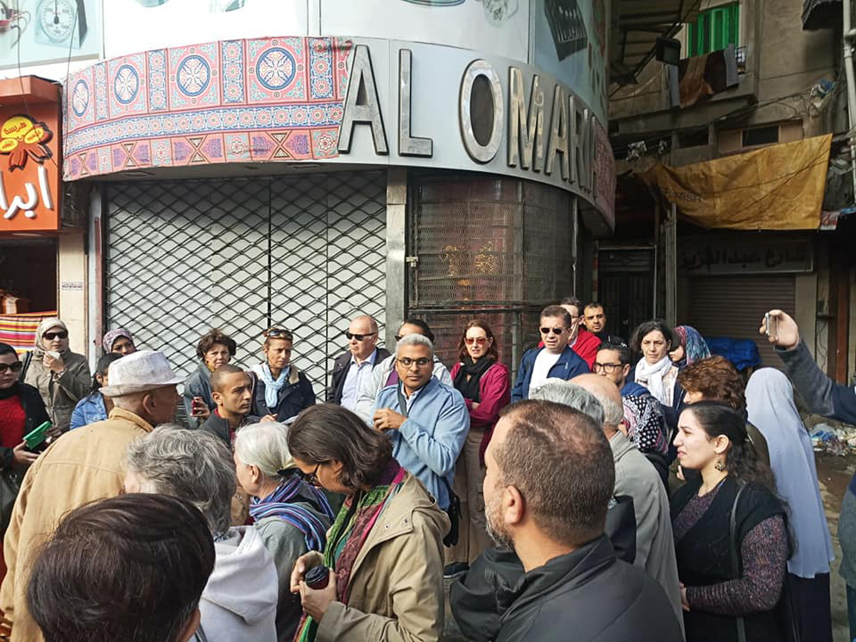 وشارك في الجولة نحو 40 من الفرنسيين والمصريين المهتمين بالتراث. وقاد الجولة الدكتور إسلام عاصم، نائب رئيس جمعية التراث للفنون التقليدية بالإسكندرية. حيث بدء حديثه عن شارع “الباب الأخضر”، والذي يربط بين منطقة المنشية وصولا إلى نهايته بالقرب من منطقة مينا البصل.